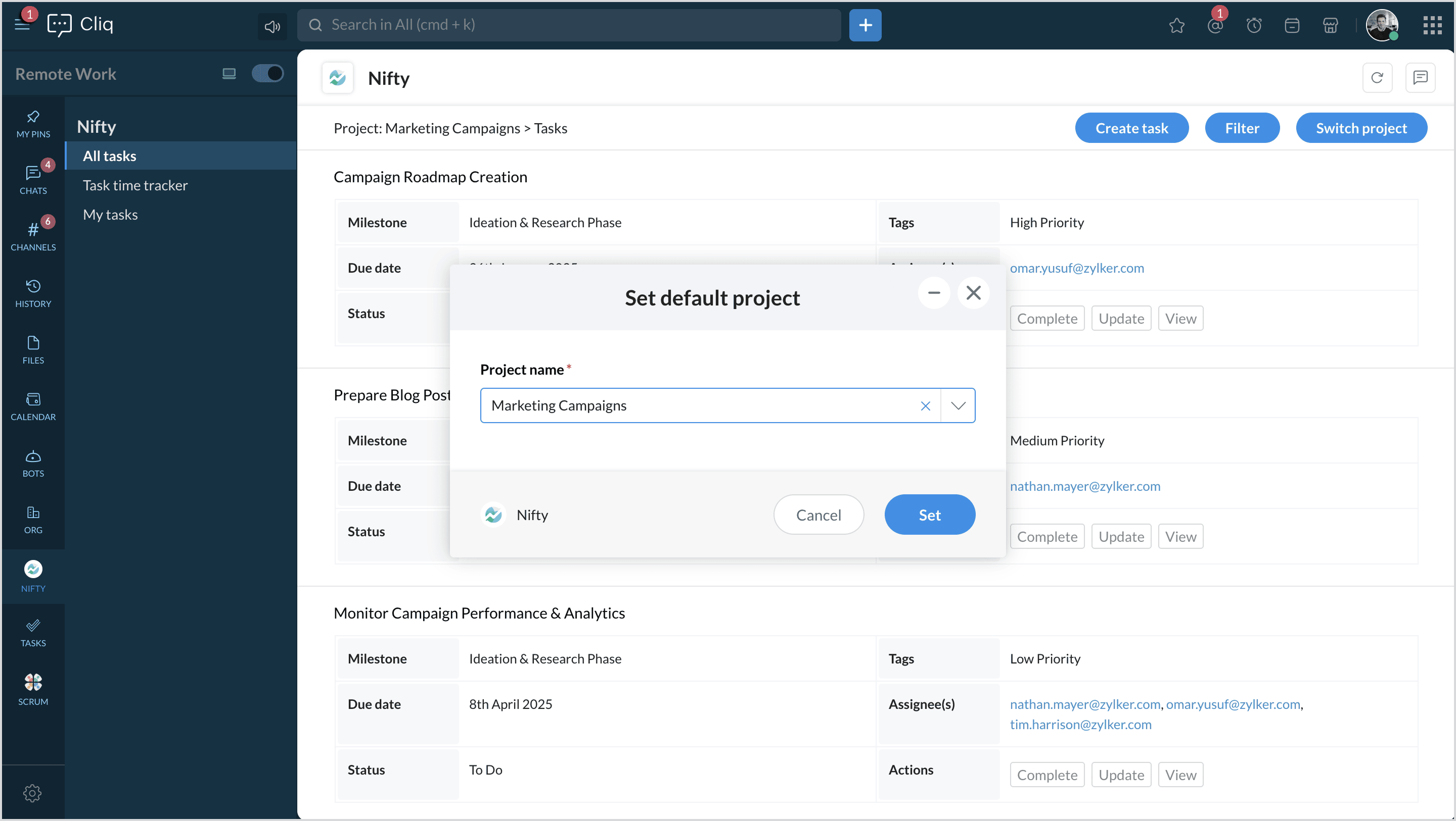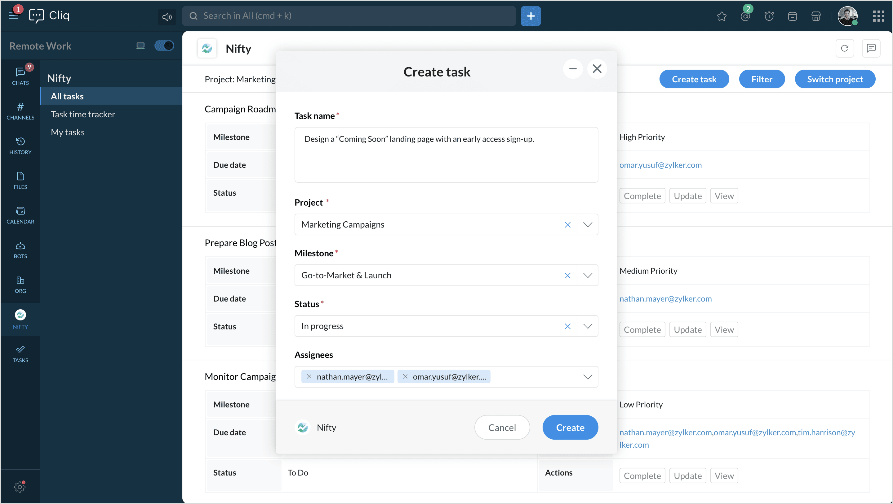 Nifty is the remote collaboration hub where you can manage projects, tasks, and communications — all in one place. By integrating Nifty with Zoho Cliq, you'll be able to create project tasks and assign them to users, create and view project docs, get instant notifications on projects, and view your task time tracker report.