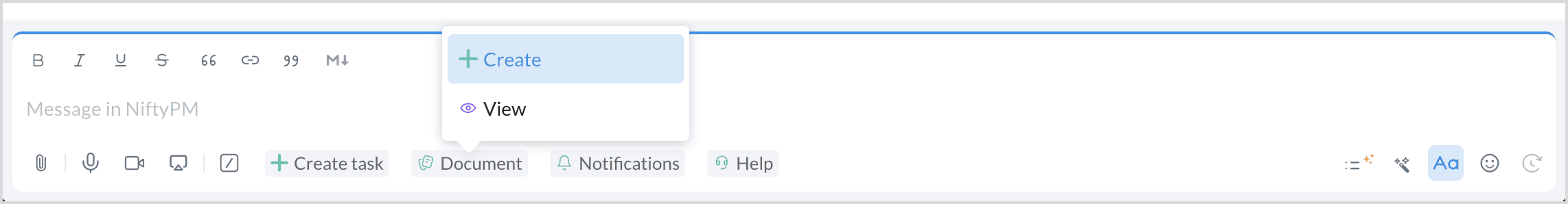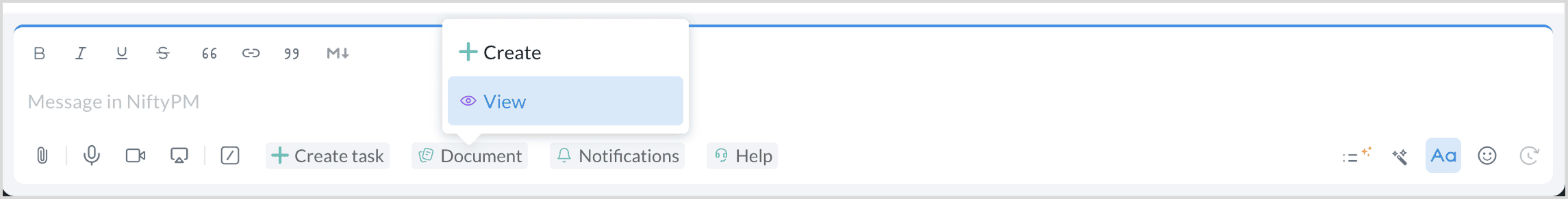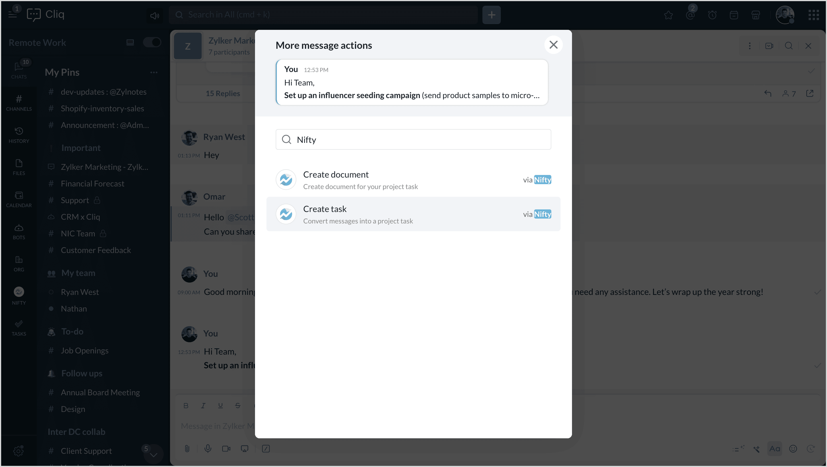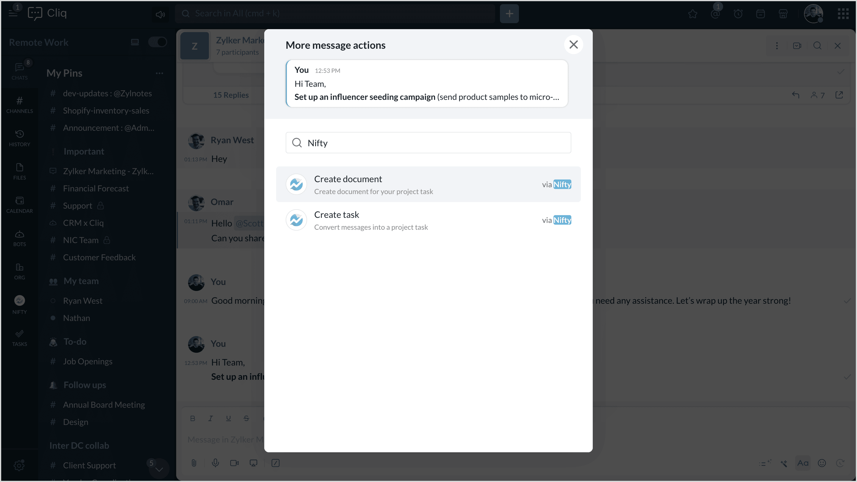 Message action: Hover over a message you want to convert into a document content, click the kebab icon (three dots), select More, search for Nifty, and click Create document.