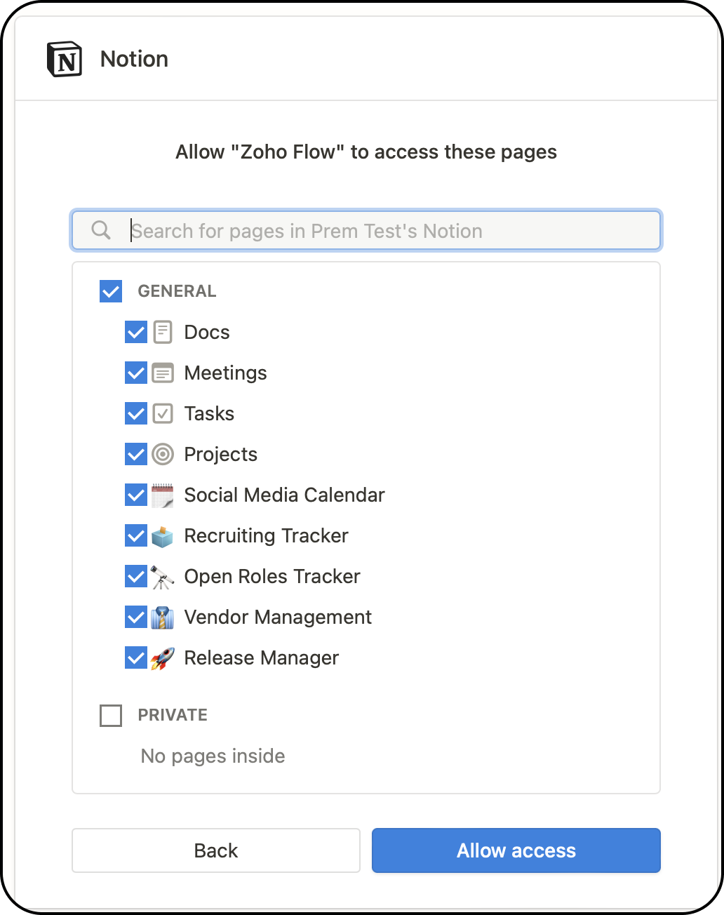After successful installation, you will need to authenticate your Notion account and select the pages you want to give access to inside Cliq.