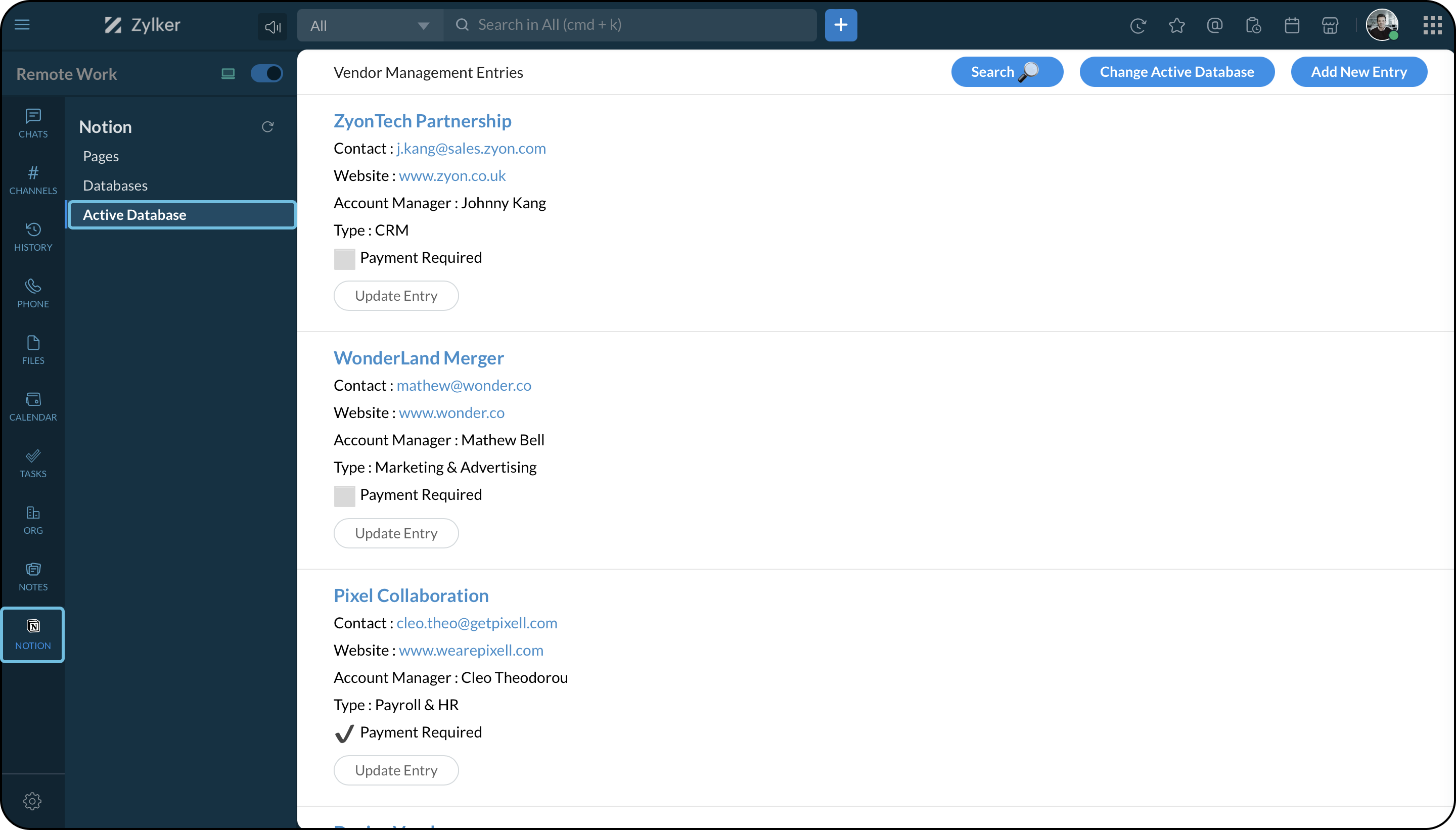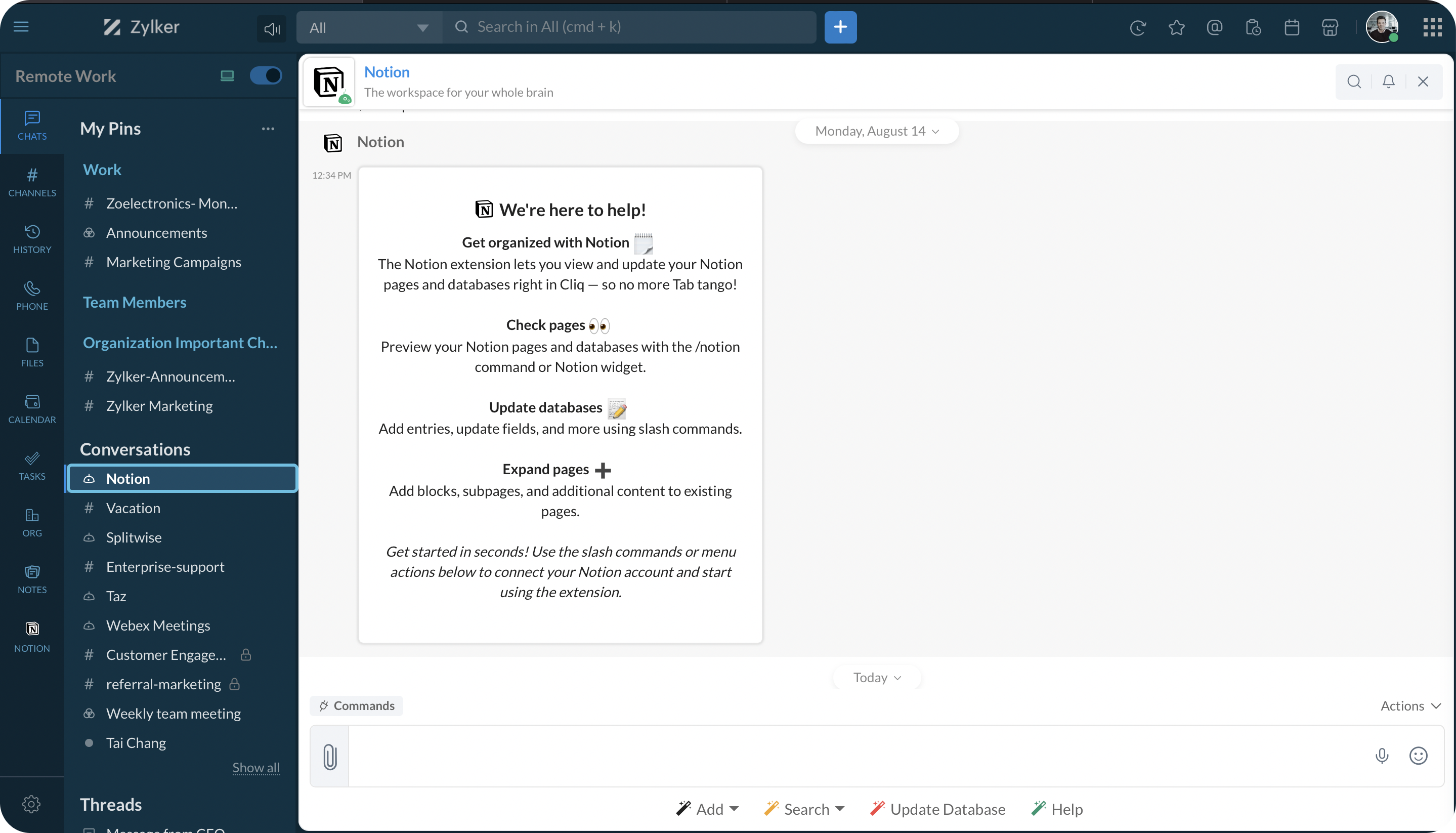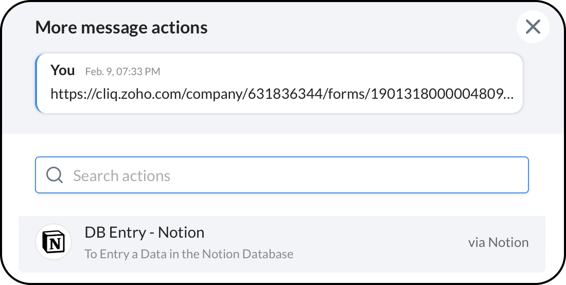By integrating Notion with Zoho Cliq, you can manage your documents by bringing in pages and databases and viewing them inside Cliq.
