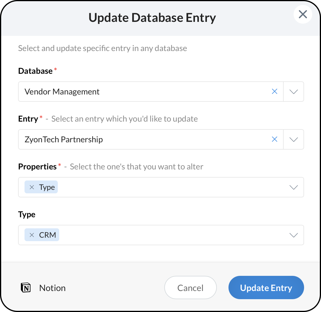 You can use the slash command "/notion" in your message composer and use the three suggestions - Add, Search and Update Database.