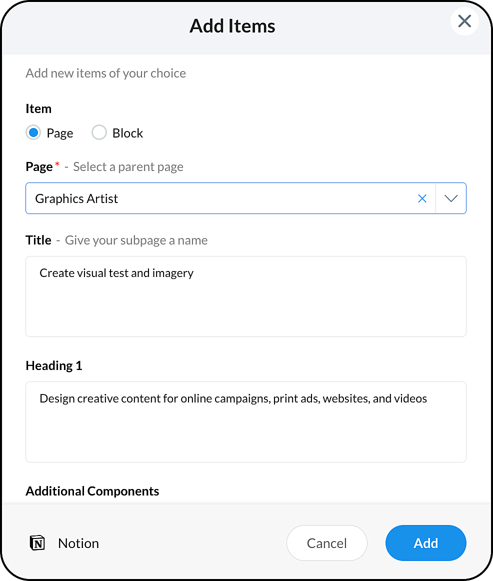 You can add components such as text elements (Heading 1, 2, 3, paragraph), style elements (Callout, Quote, To-Do, Divider), and media files (Image, Video, PDF, File, and Embed) to the page.
