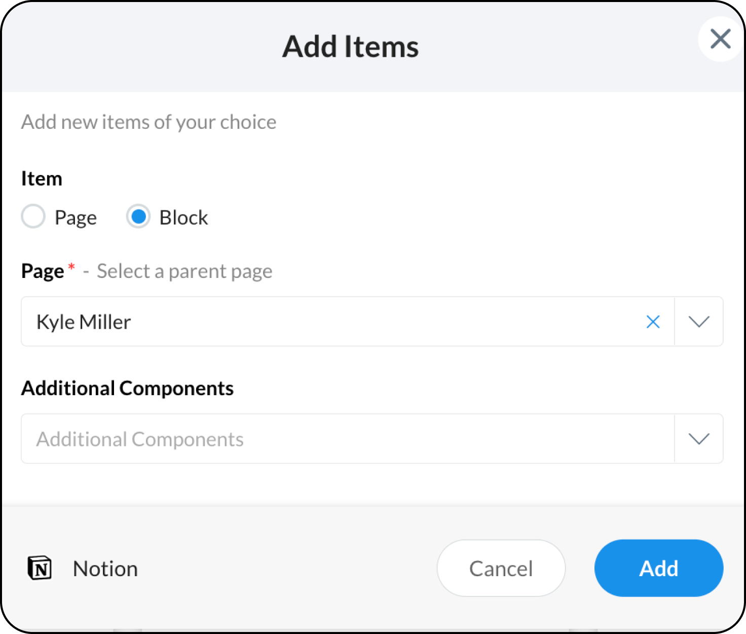 When you select Add, an Add Item pop-up will appear. You can select what you want to add and a notification will be posted in the chat.