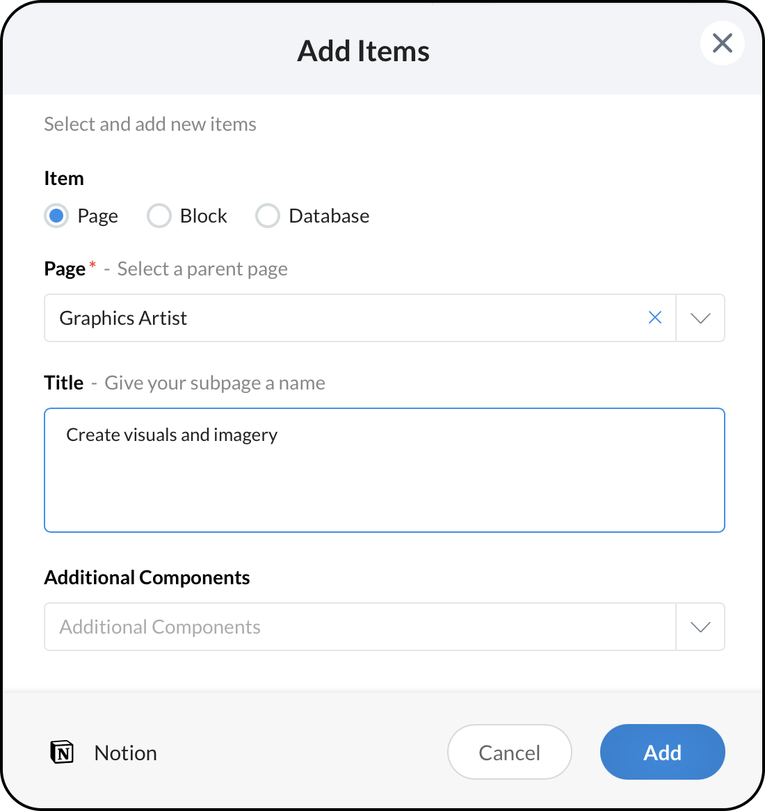 By using the Add bot action, you will be able to add a subpage, block, and database entry. A notification will be posted by the bot upon addition.