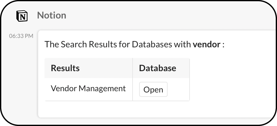By using the Search bot action, you will be able to search for a database or page using the keyword. The search results will be posted by the bot.