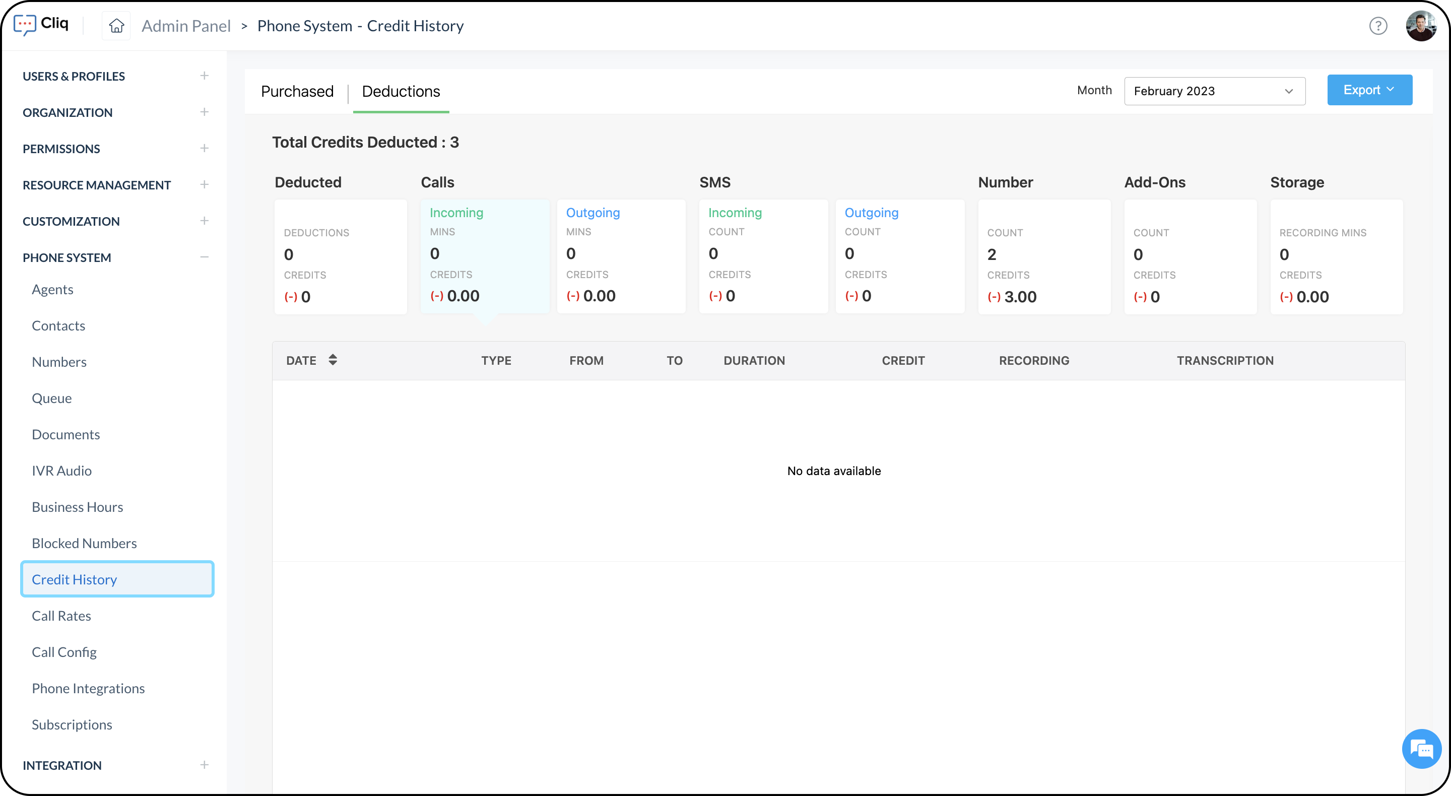 Credit HistoryYou will need credits to make calls, purchase numbers, send voice mails, record calls and for storage, etc. The credit history on total purchases and deductions can be viewed inside Cliq.