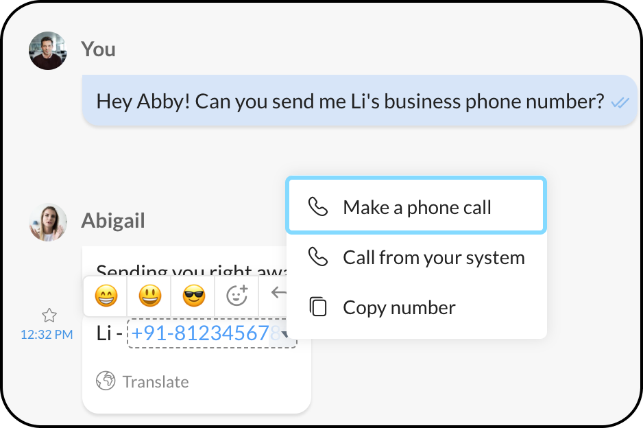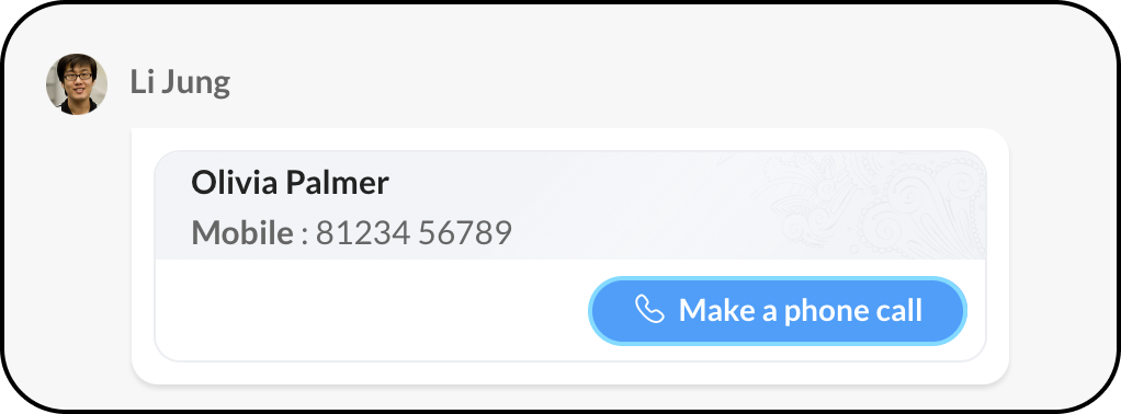 Make a phone call from message contentWhen a user sends a message that has a mobile number, Cliq's smart suggestions auto-detects the number and provides options to make a phone call.