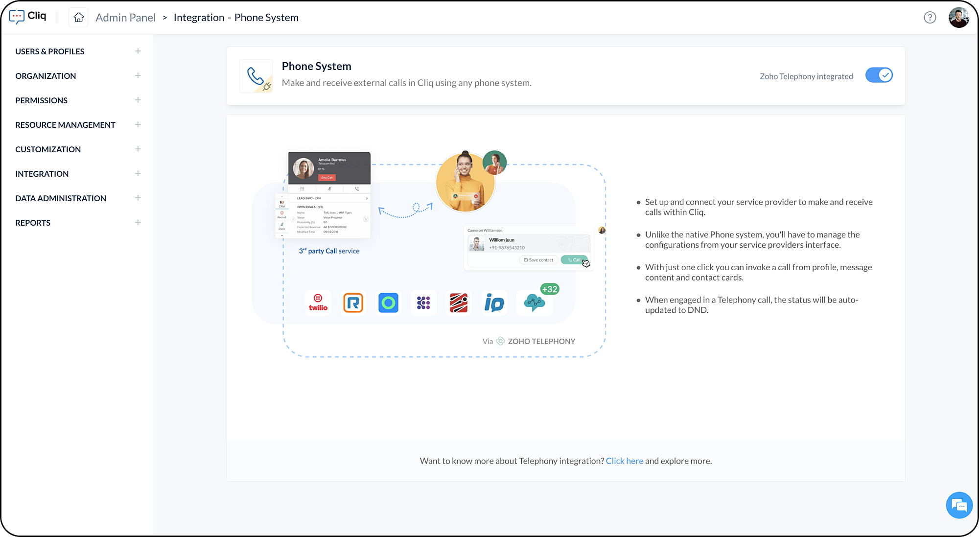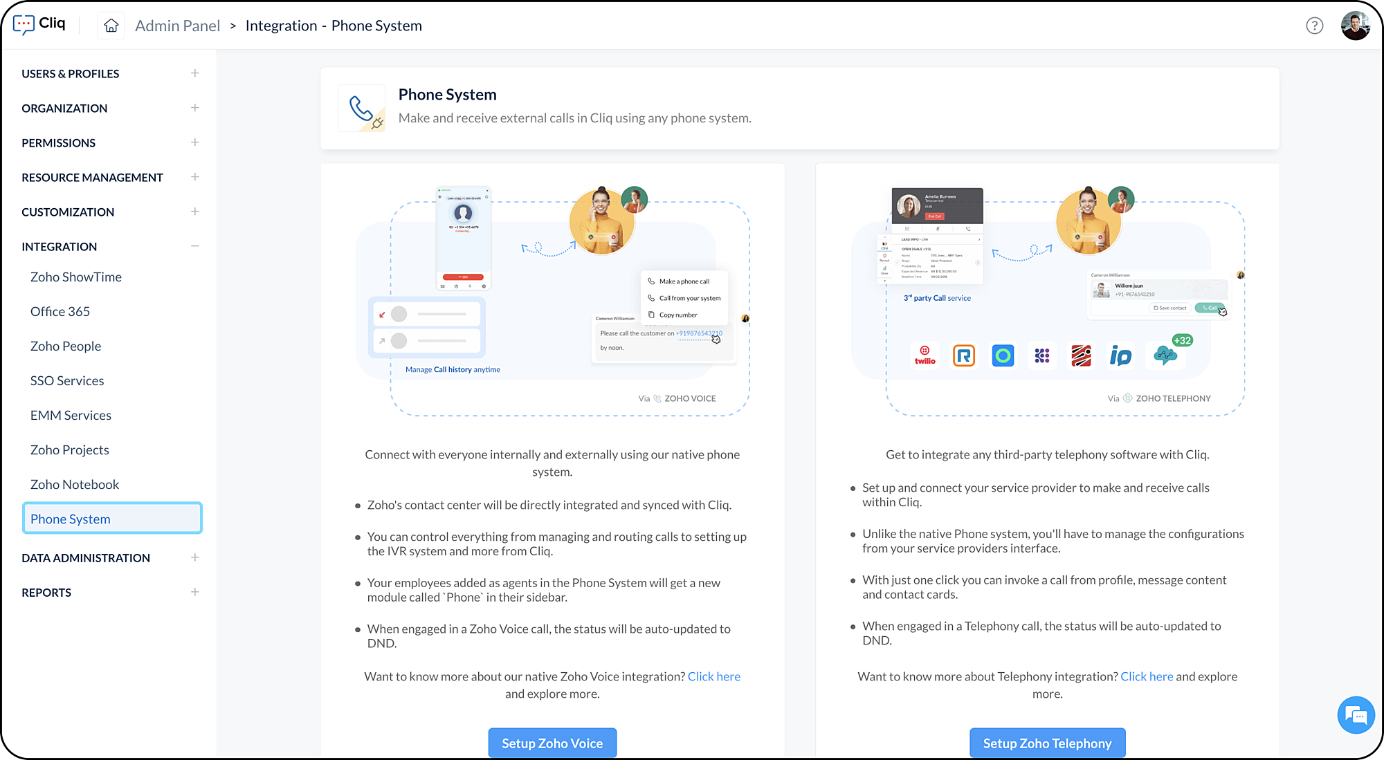 Zoho Cliq allows you to integrate with Zoho Voice, which is Zoho's in-house phone system, or integrate with your favourite cloud phone system via Zoho Telephony to make or receive sales and support calls.