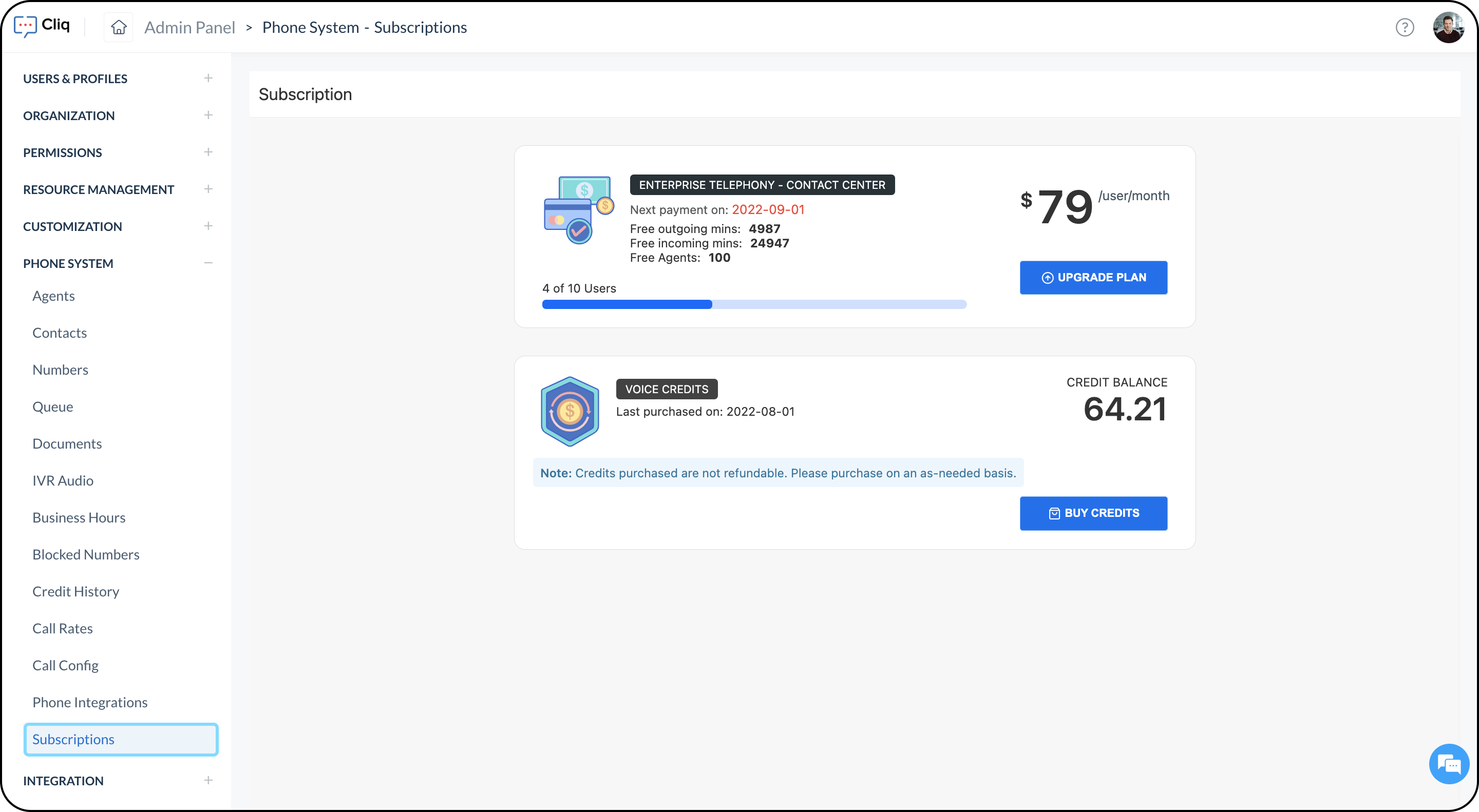 SubscriptionsDifferent subscriptions provided by Zoho Voice will be available where users can purchase credits based on plans.