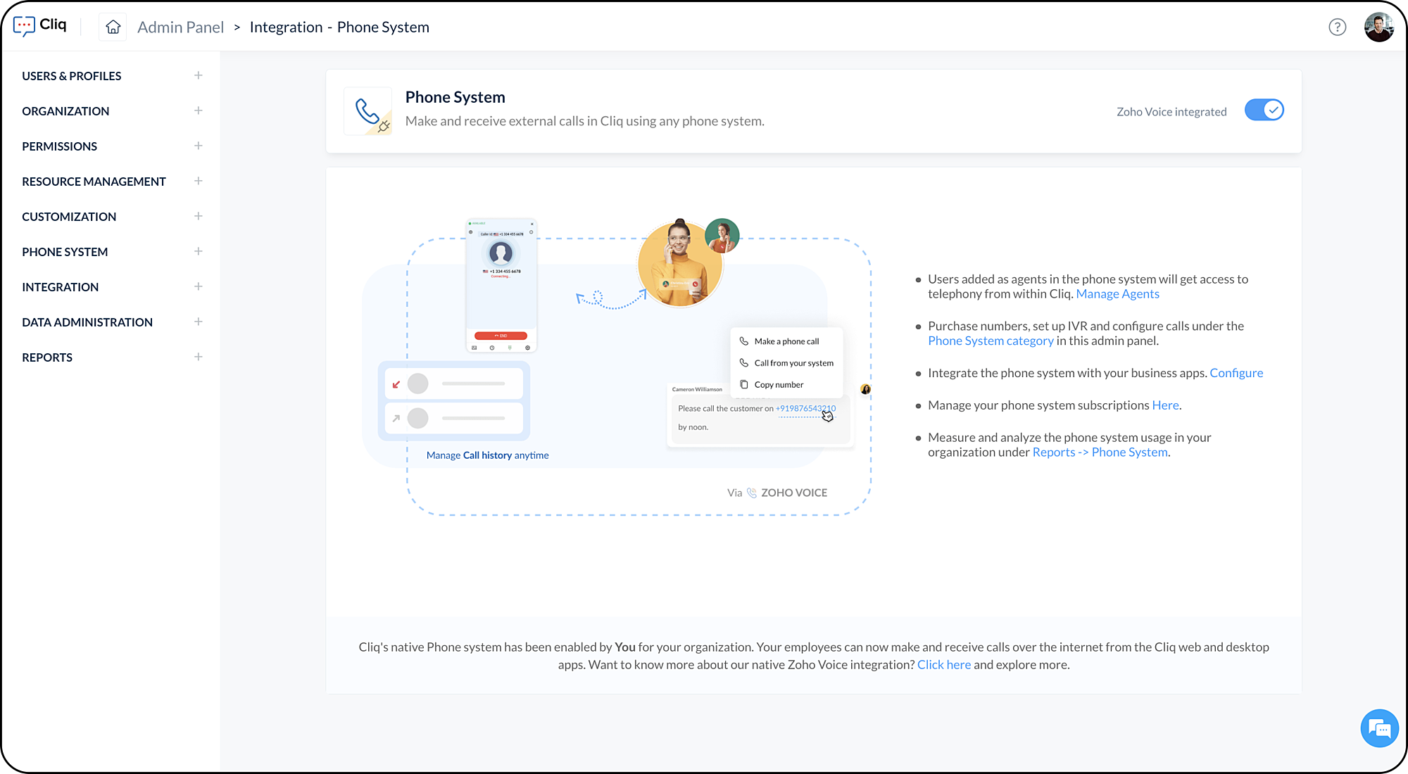 When a user integrates Zoho Voice, a new module "Phone System" gets displayed in the admin panel. You will find the module with a list of options in Zoho Voice available under Phone System that users can perform inside Cliq.