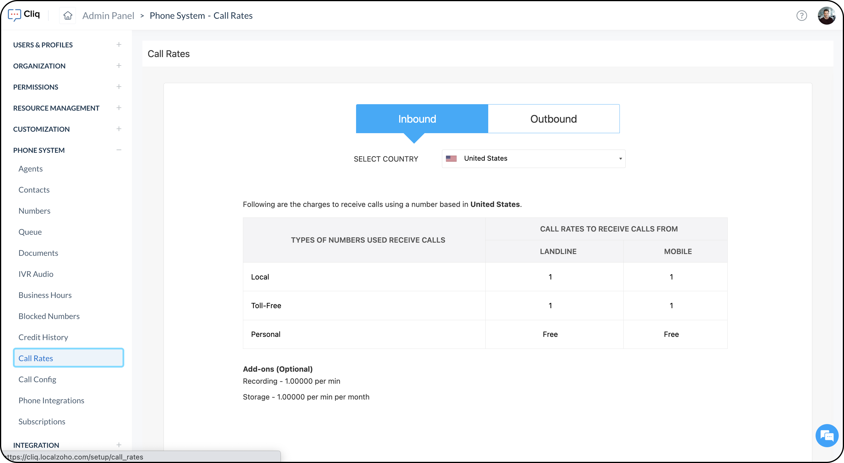 Call RatesYou can view the inbound and outbound call rates based on the country in Cliq.