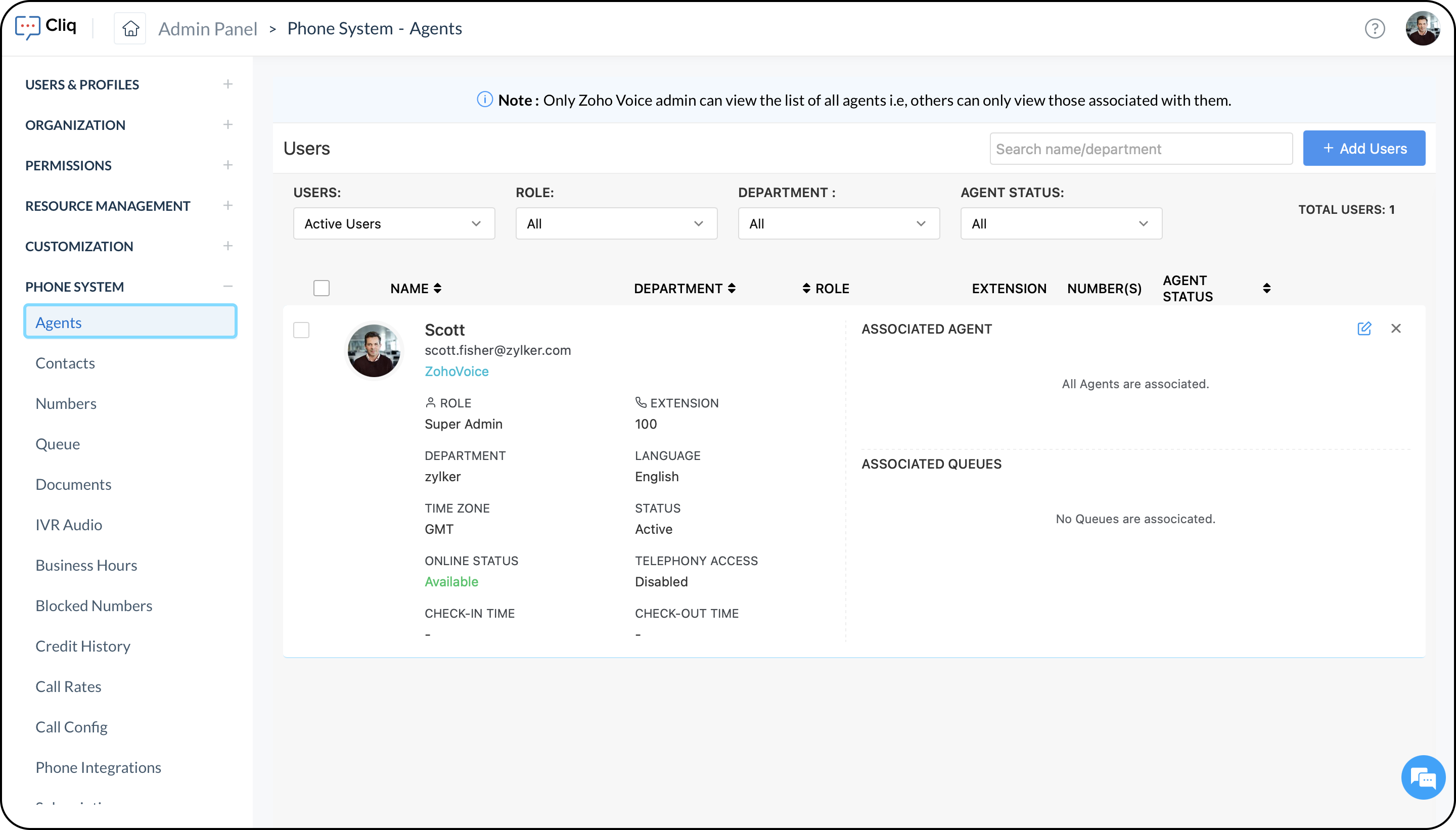 AgentsAgents are users in Zoho Voice. Only an admin can view the list of all the agents and others can view only the agents associated with them.