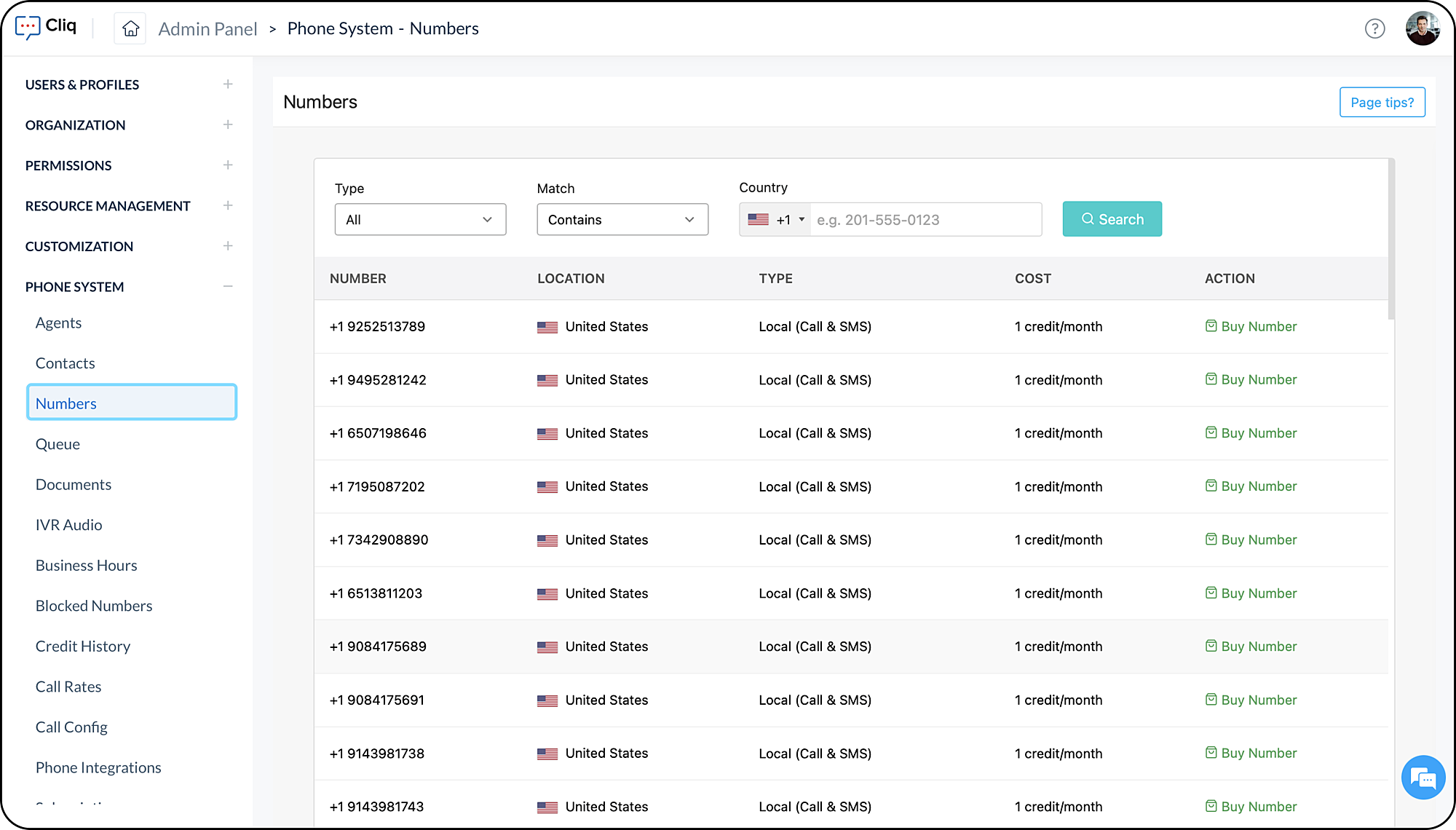 NumbersYou can purchase phone numbers to make and receive local and international business calls.