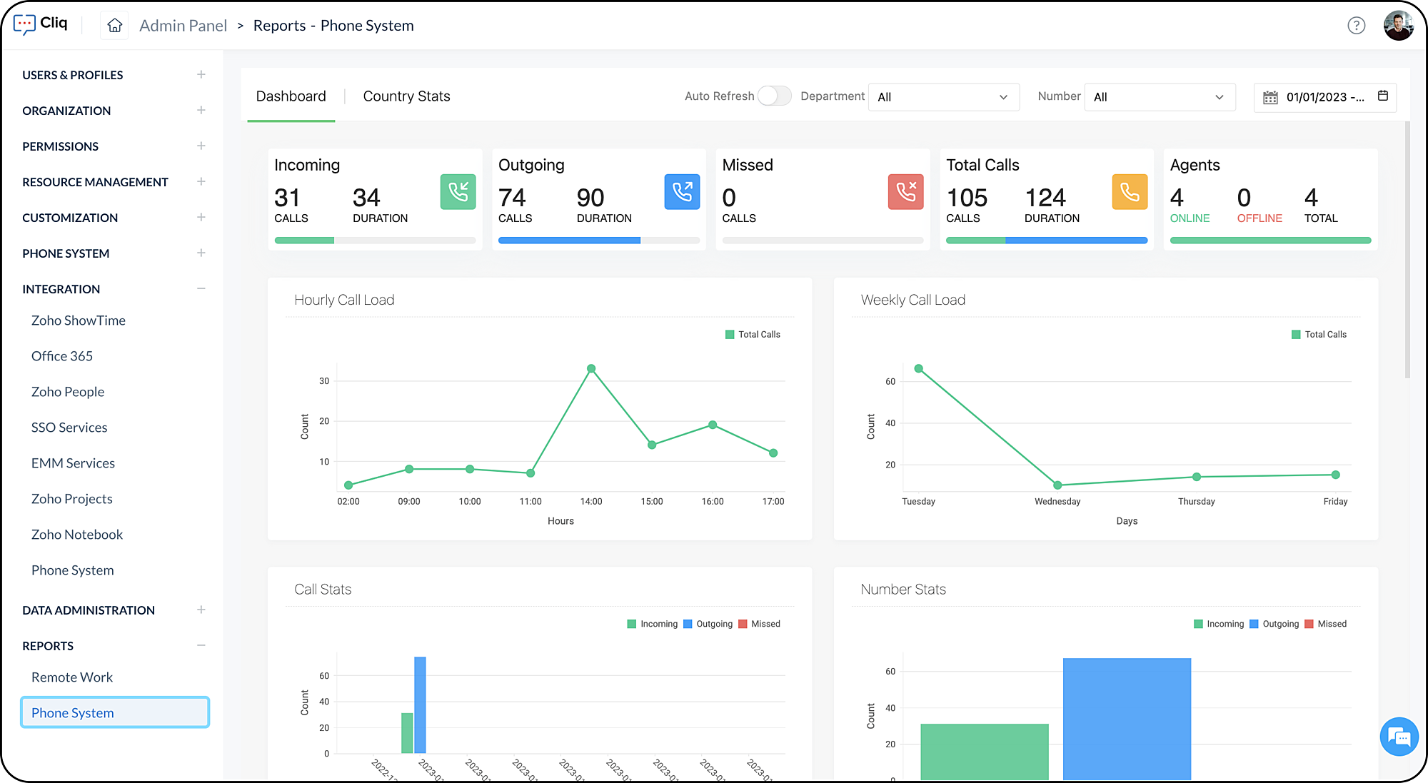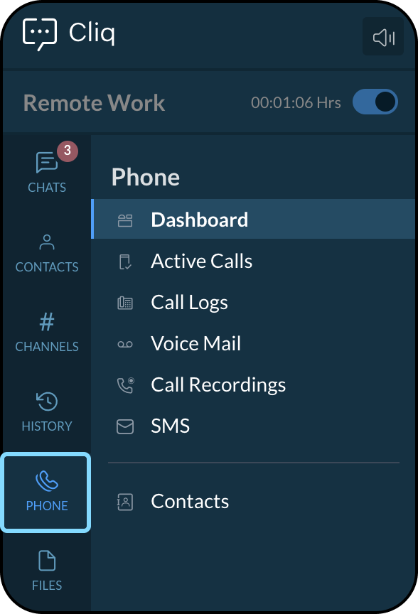 While integrating Zoho Voice with Cliq, a module appears on the navigation sidebar where users can view the dashboard, logs of calls and messages. Active calls can be viewed only by admins of all the agents listed.