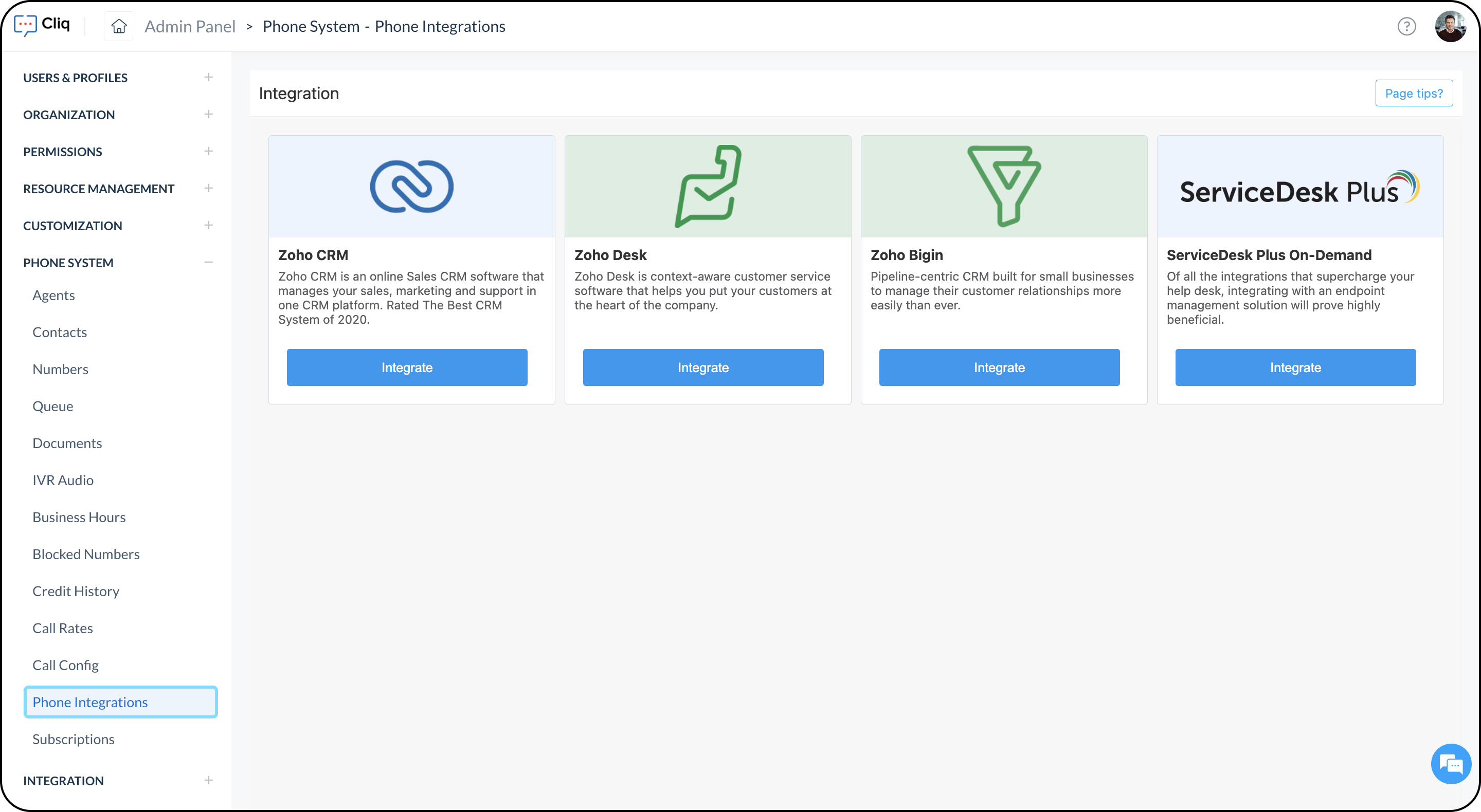 Phone IntegrationsYou can integrate Zoho Voice with other Zoho apps such as Zoho CRM, Zoho Desk, Bigin, and ServiceDesk Plus On-Demand.