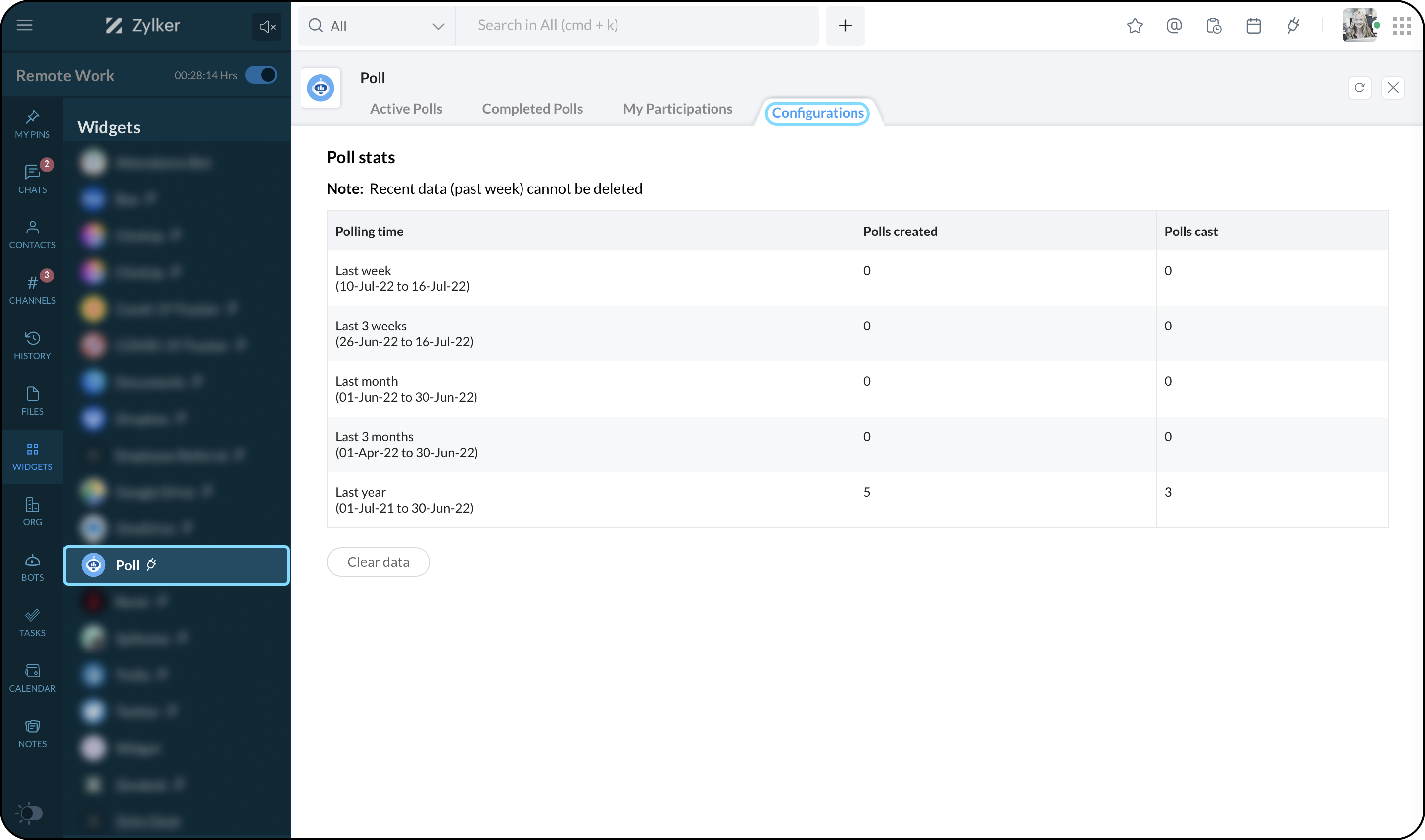 Polls cast - Poll cast shows you the number of users who cast their vote within the specific polling time. Admins can clear the data statistics of the poll by clicking on the Clear data button present below the poll stats however, it is to be noted that recent data (past week) cannot be deleted and non-admins can only view the stats, cannot delete them.