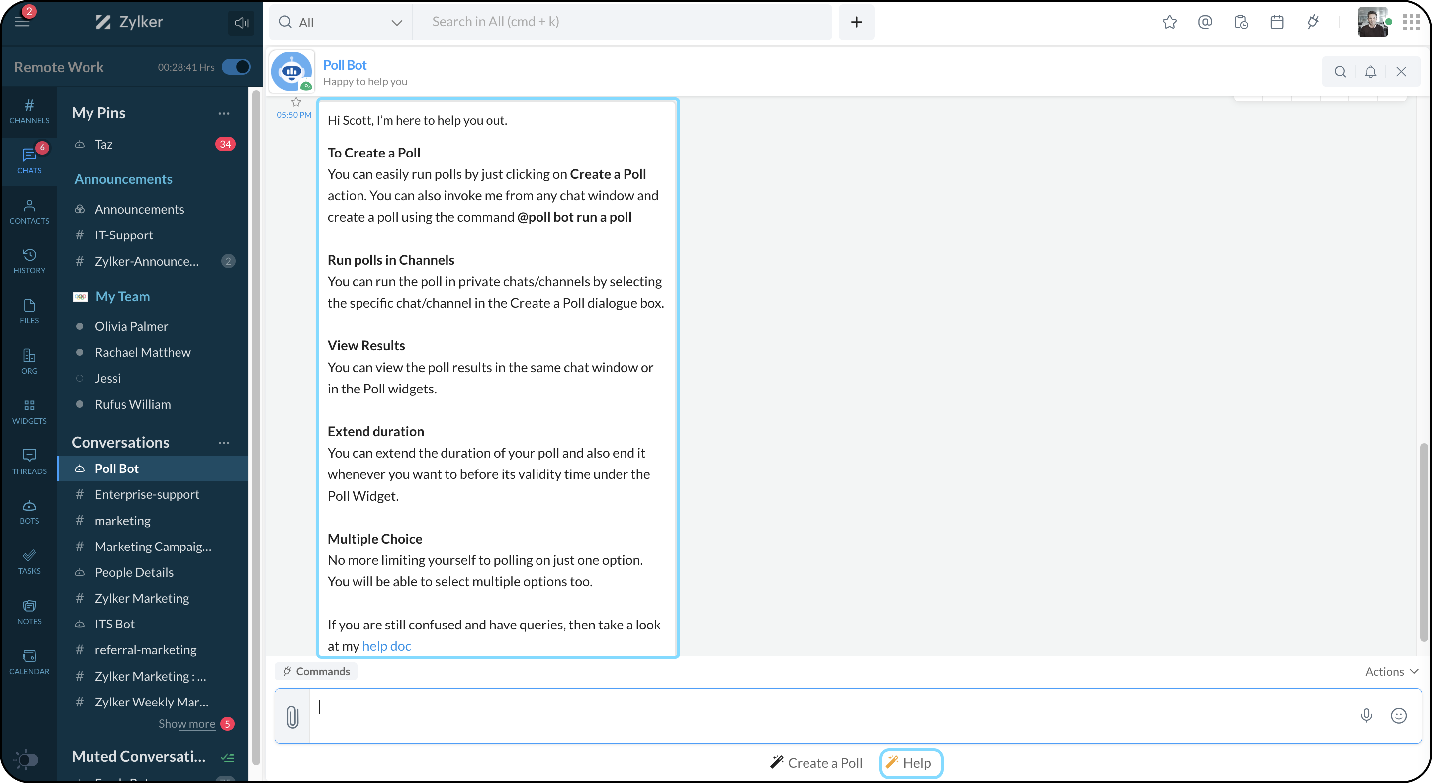 The help bot menu action in the Poll Bot provides you with information on how you can leverage various actions available in it.