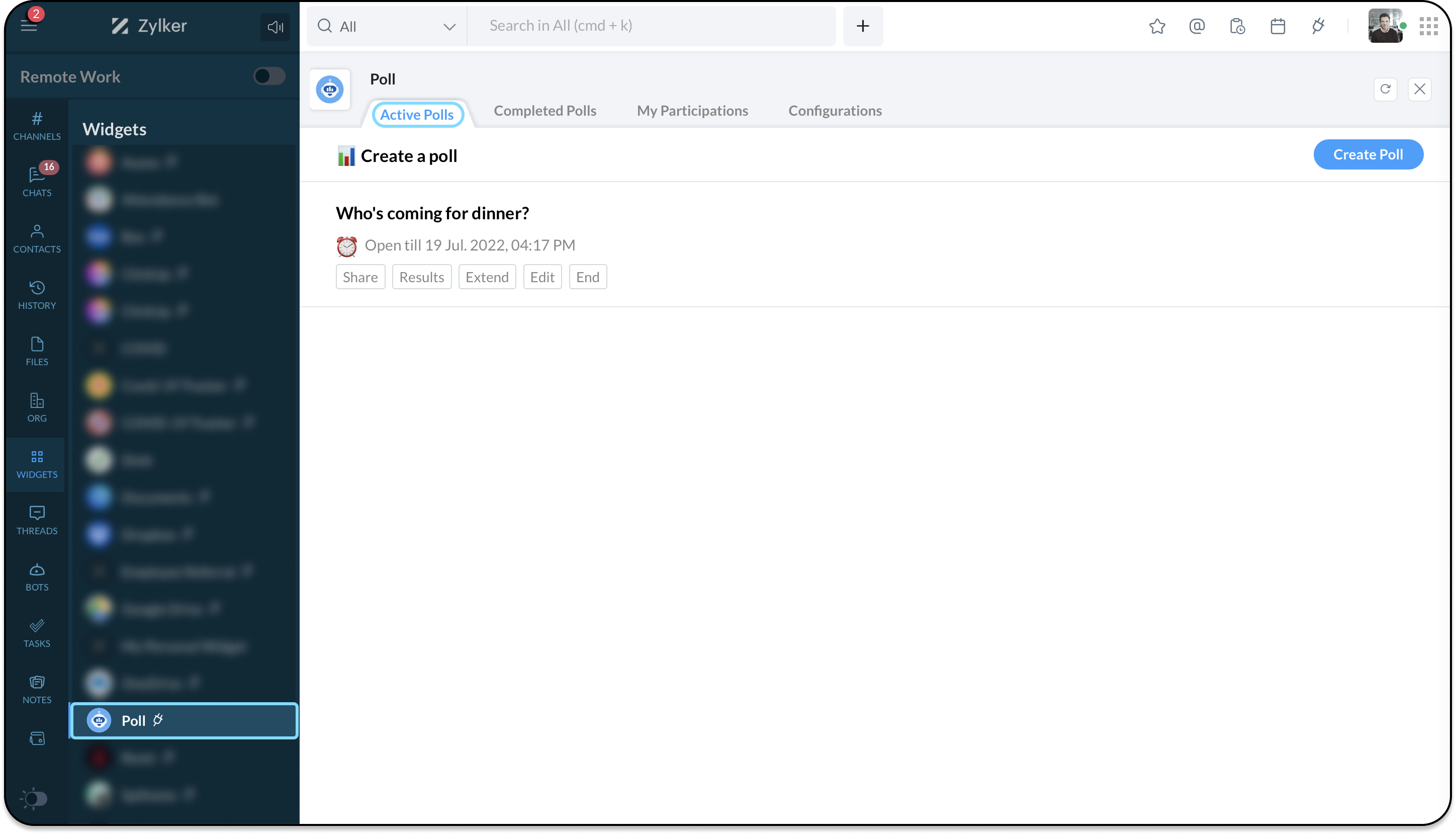 - Create - You can create a poll by clicking the Create Poll button present in the top right corner of the active poll tab.
