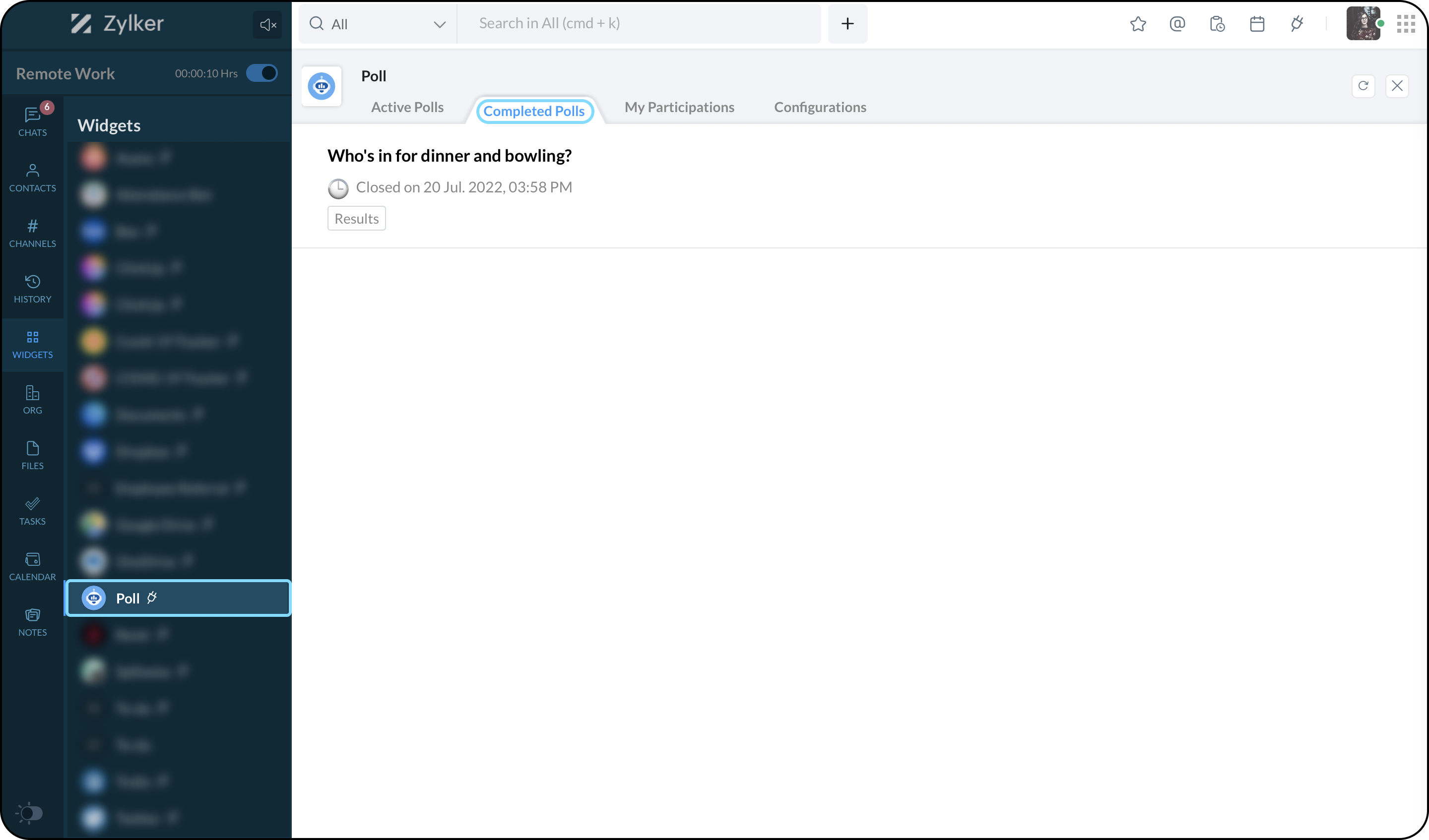 The completed polls tab shows all the previous polls hosted by you. You can view the results of these completed polls by clicking on the Results button present below the respective polls you had hosted.