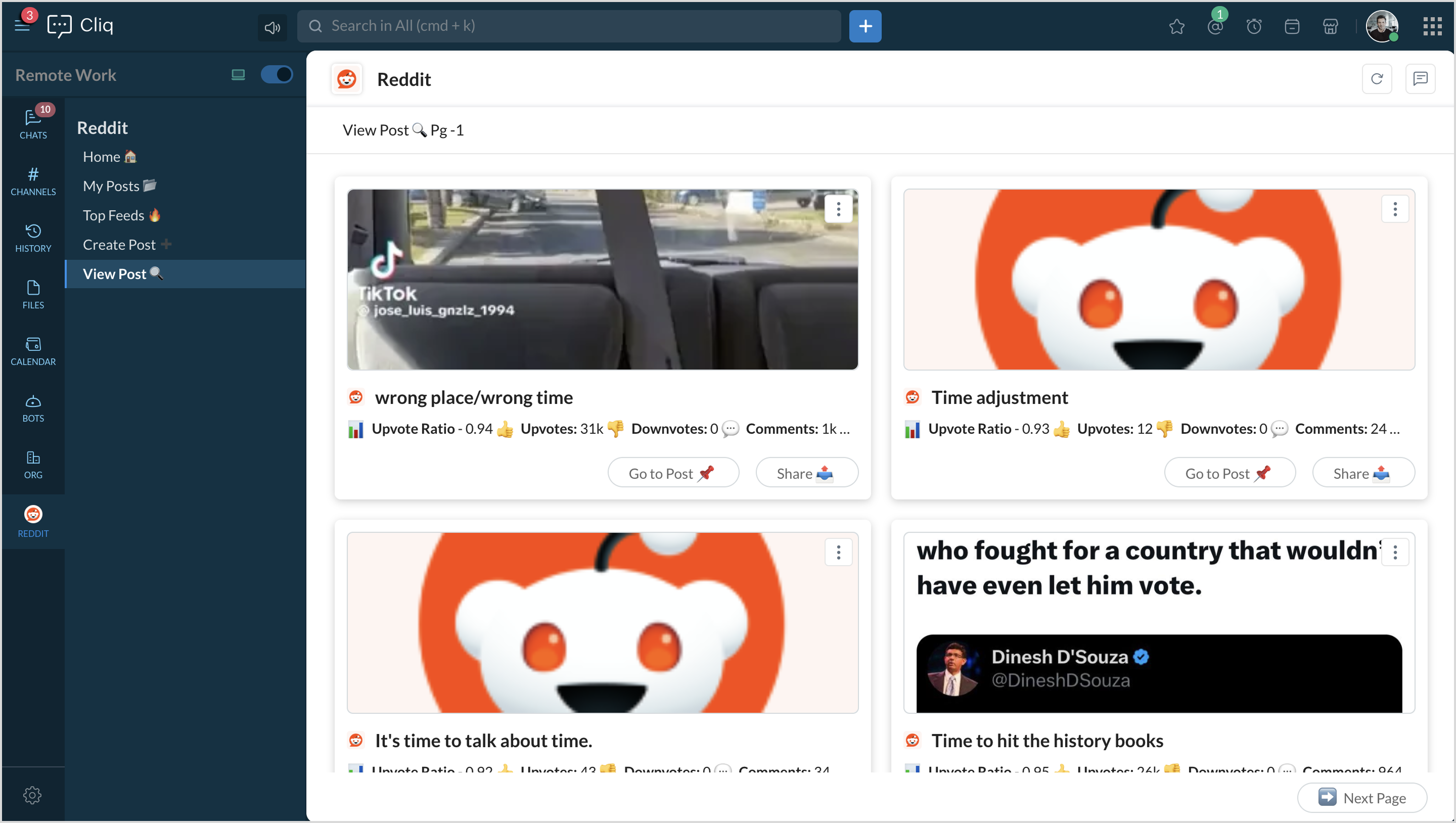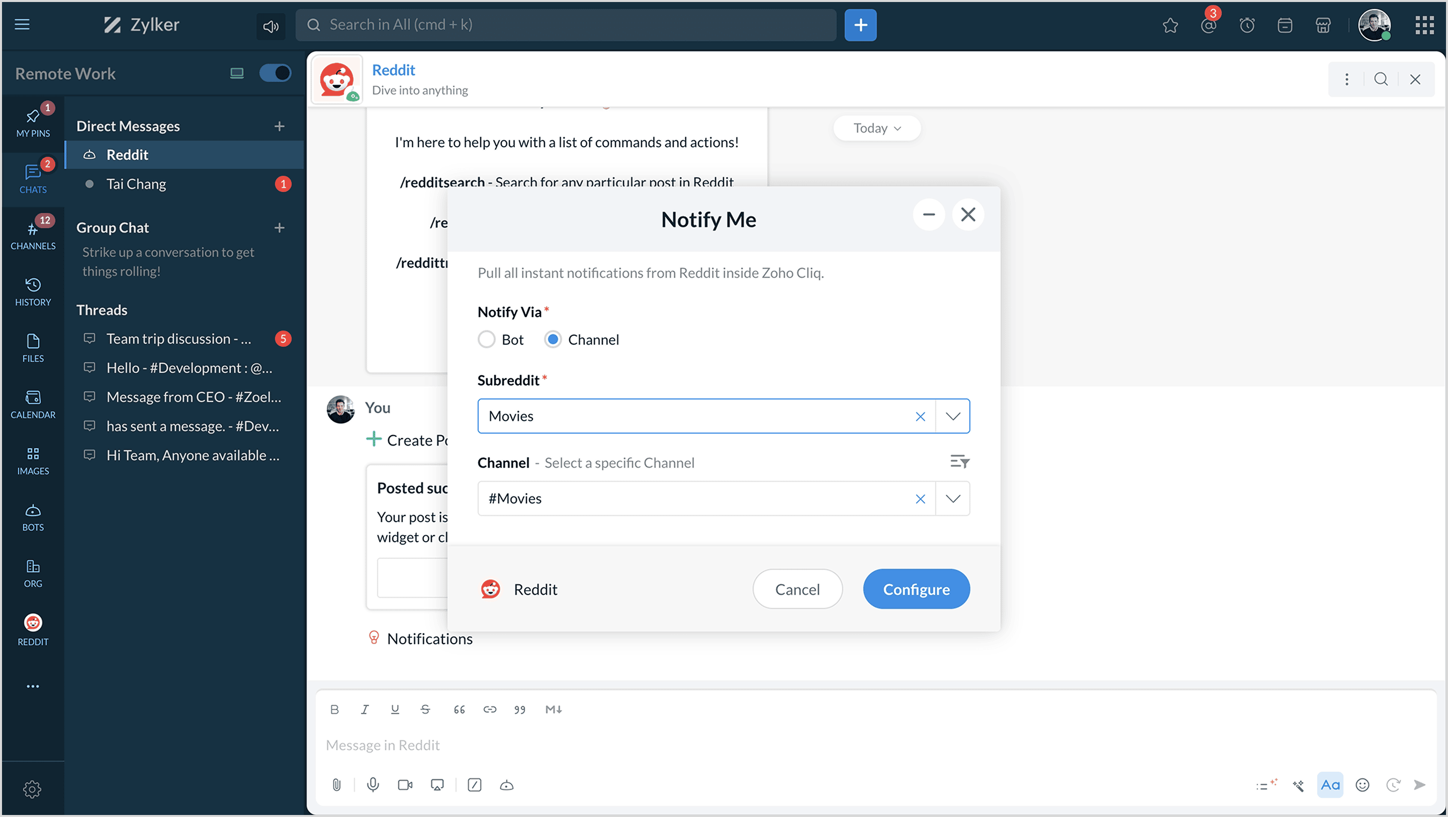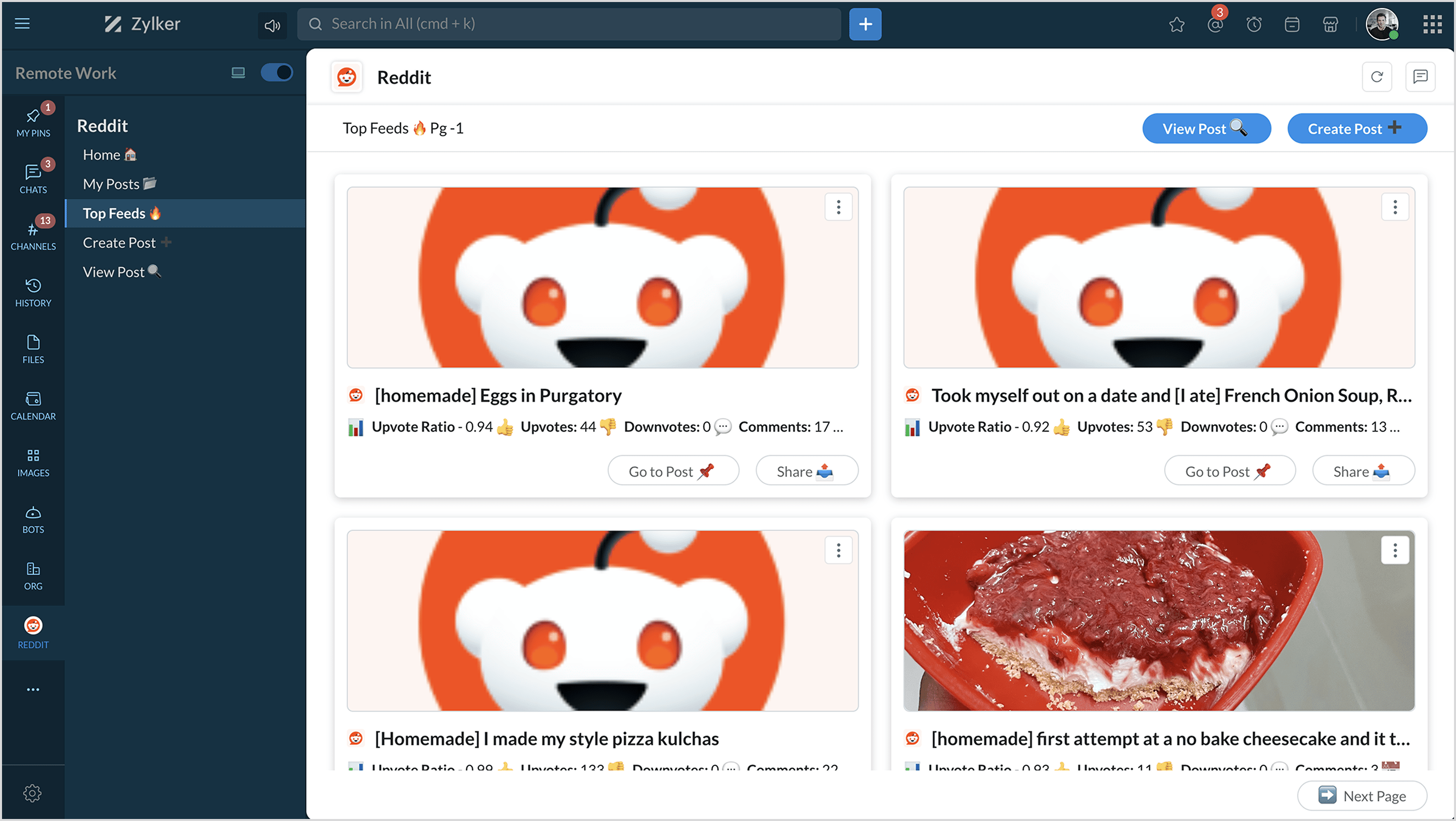 Reddit is a social news aggregation, web content rating, and discussion website. By integrating Reddit with Zoho Cliq, you'll be able to create posts, search for posts, and enable notifications for them within Zoho Cliq. This helps you save time by not leaving your communication app and still be able to participate in conversations by posting your expert view on a given topic.