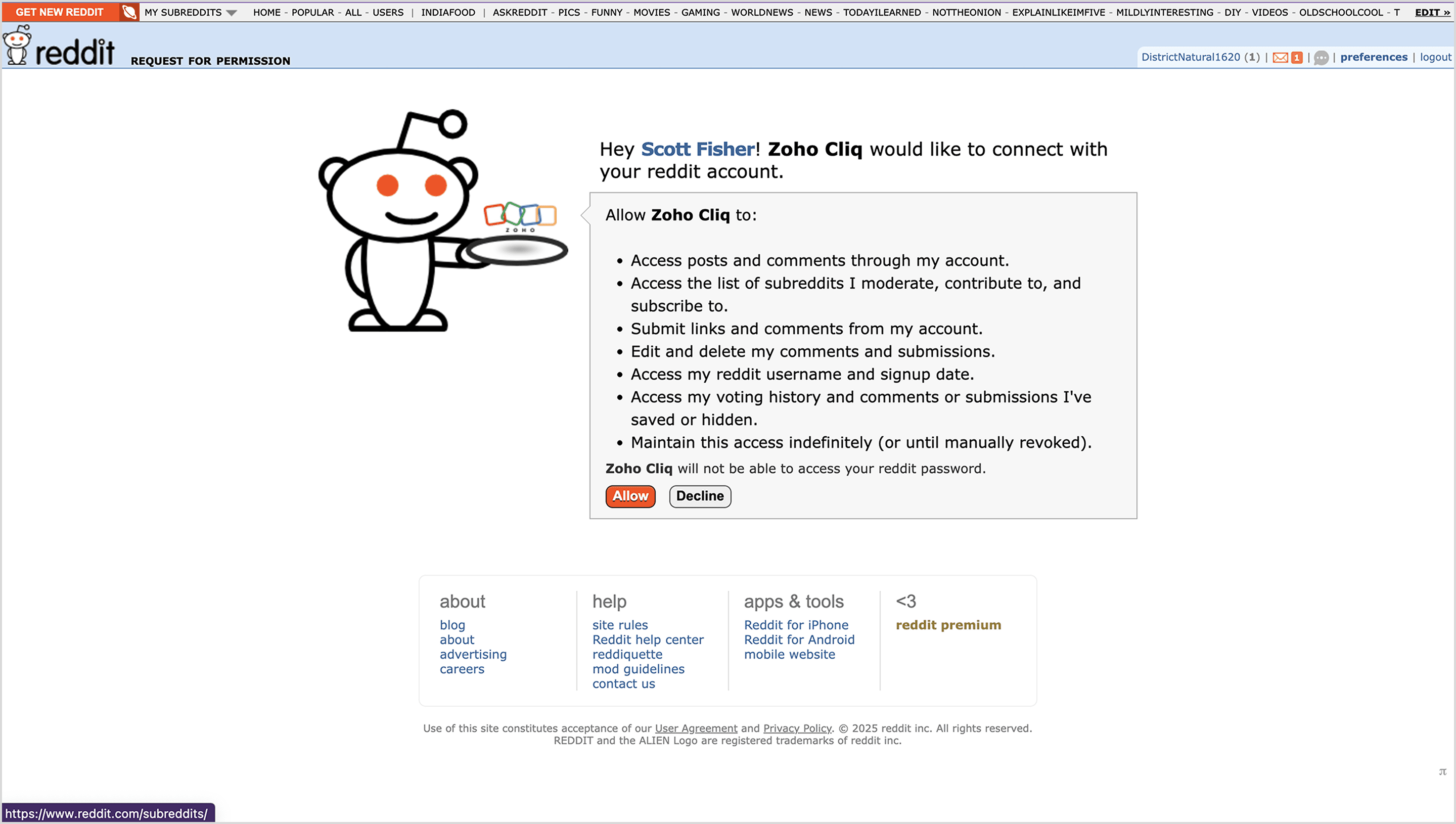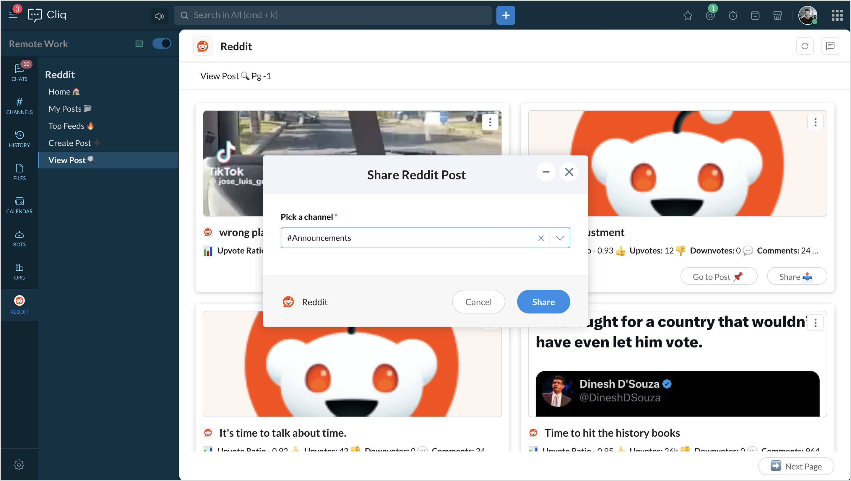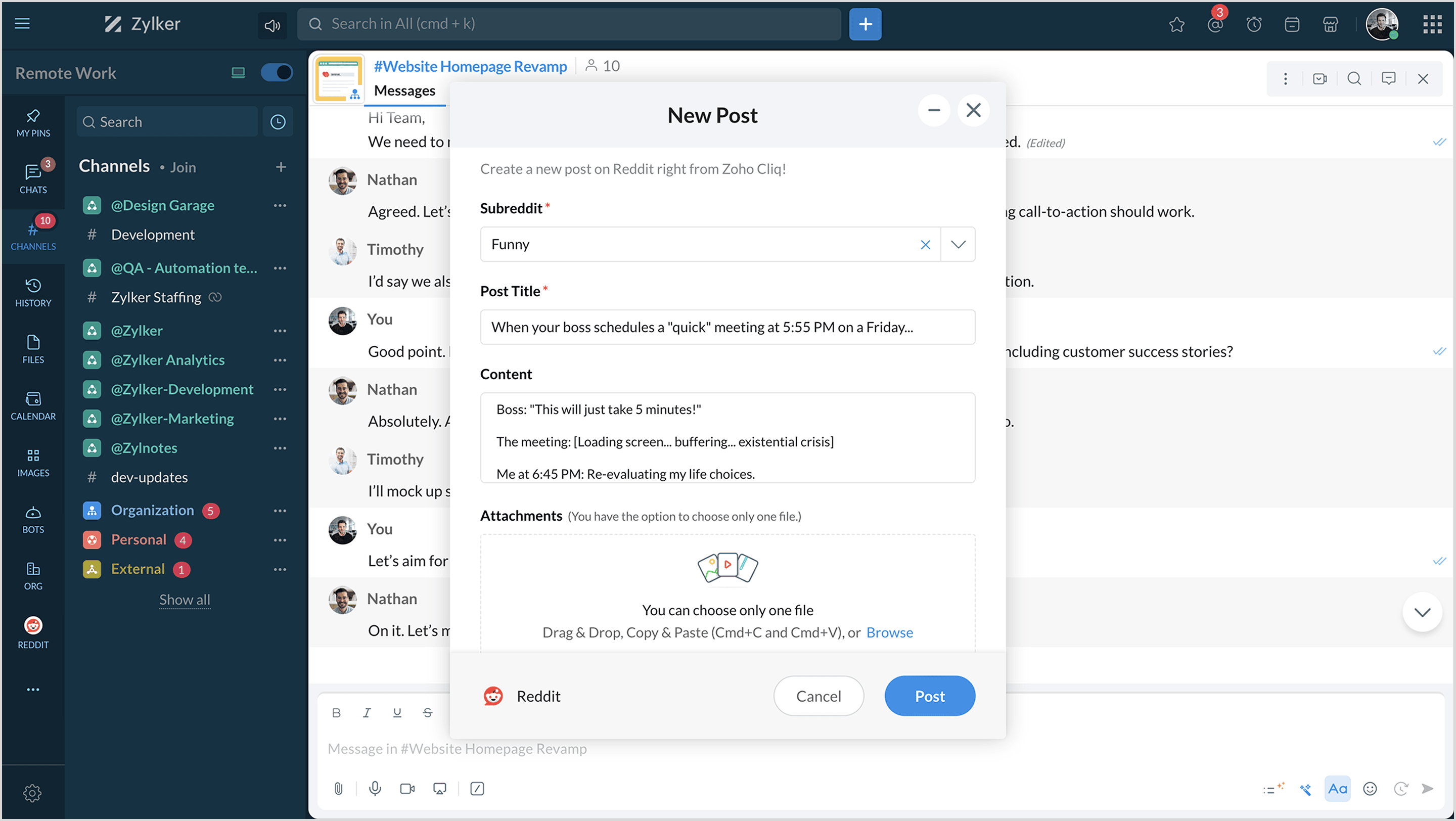 Reddit is a social news aggregation, web content rating, and discussion website. By integrating Reddit with Zoho Cliq, you'll be able to create posts, search for posts, and enable notifications for them within Zoho Cliq. This helps you save time by not leaving your communication app and still be able to participate in conversations by posting your expert view on a given topic.