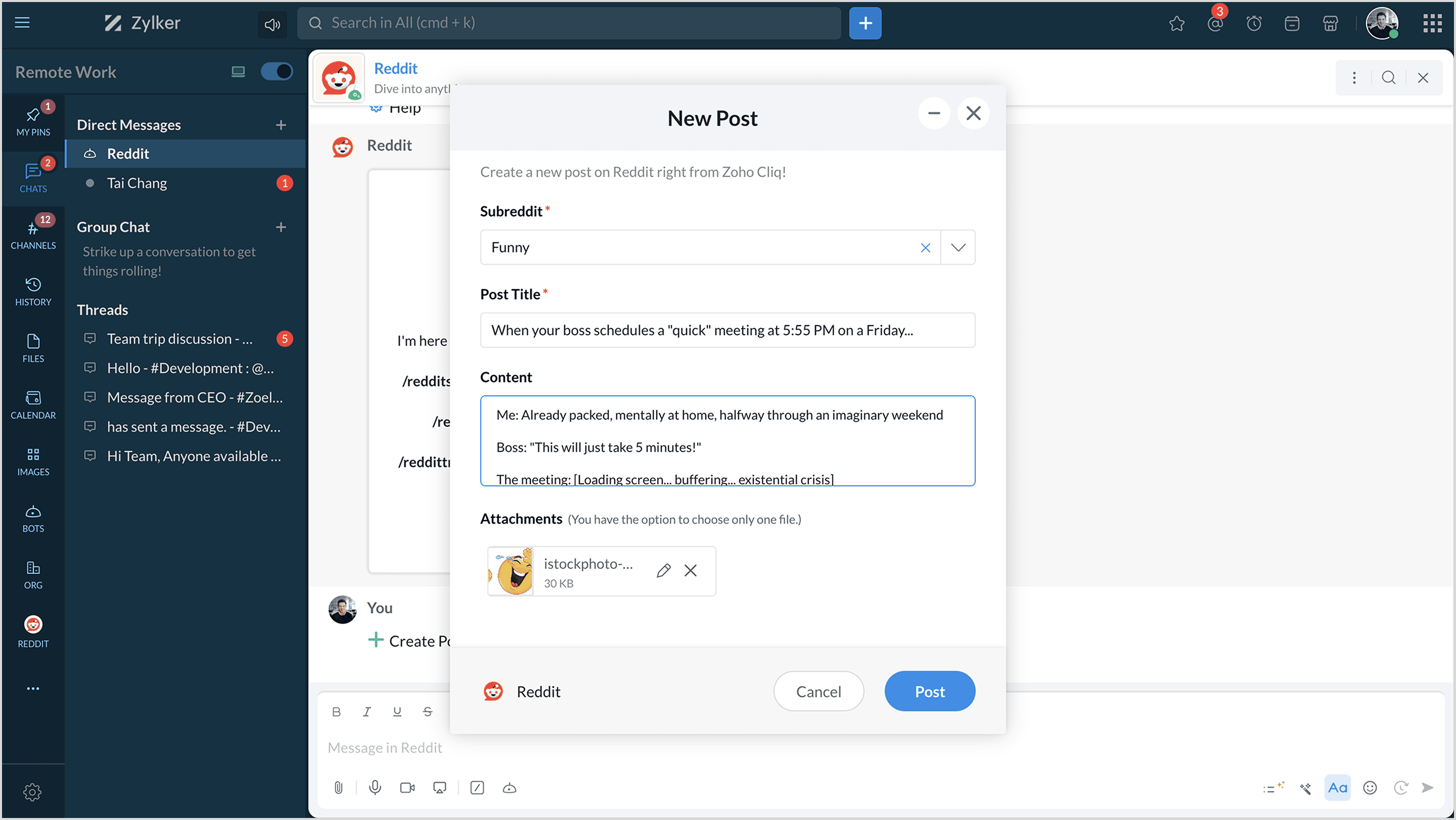 By using the slash command '/redditpost', you will be able to create Reddit posts inside Zoho Cliq.