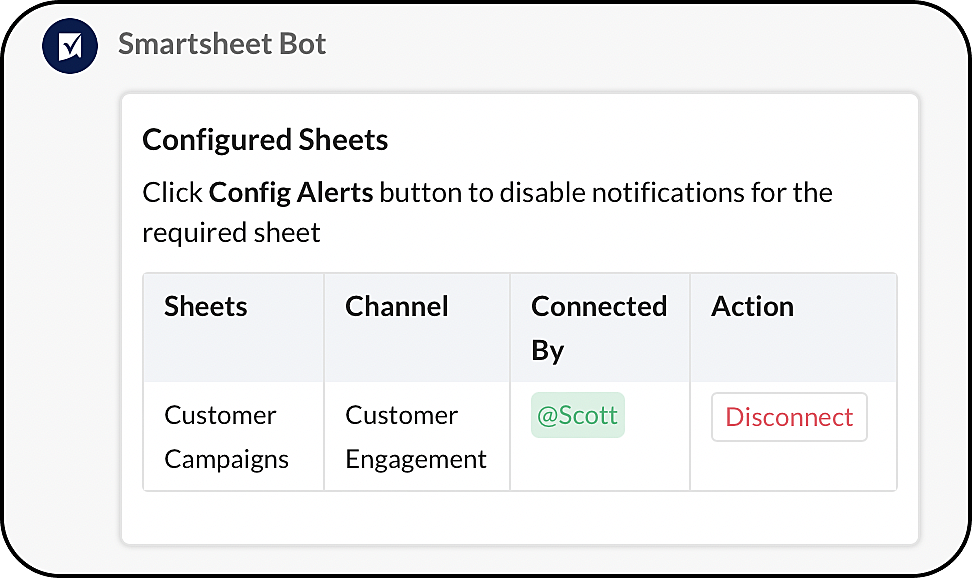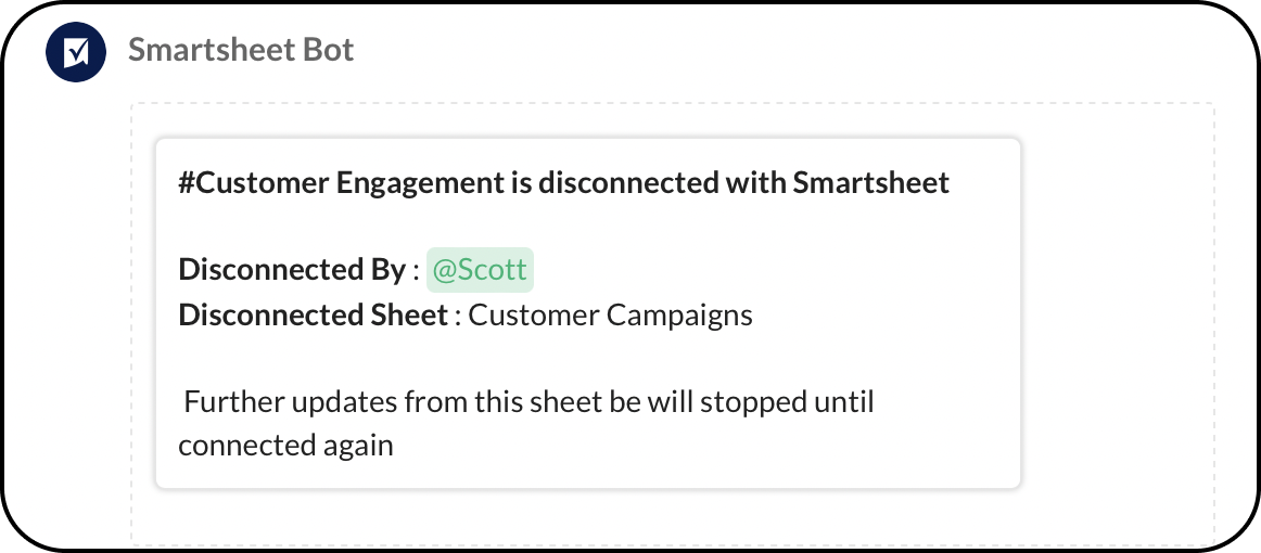 Once you select disconnect, the sheet will be unmapped from the channel and a notification will be sent to the channel. Any further updates will not be posted in the channel.