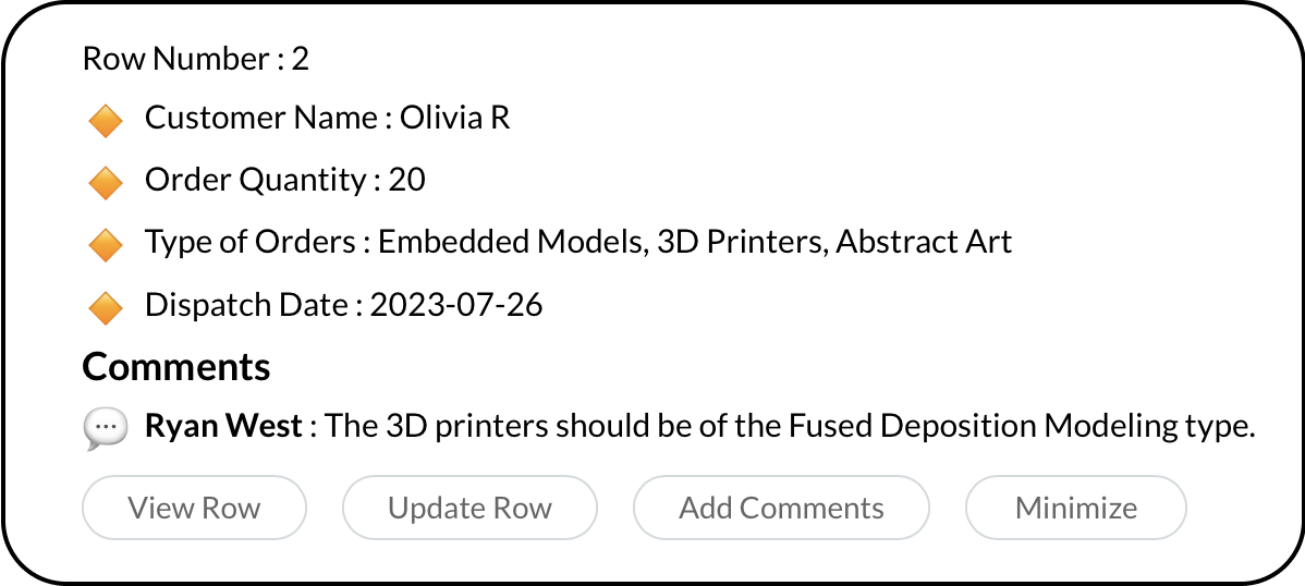 View Comments - You can view the comments added to the row. The comments you add will be displayed below the row, you can select minimize to collapse the comments or view comments to view all the comments.