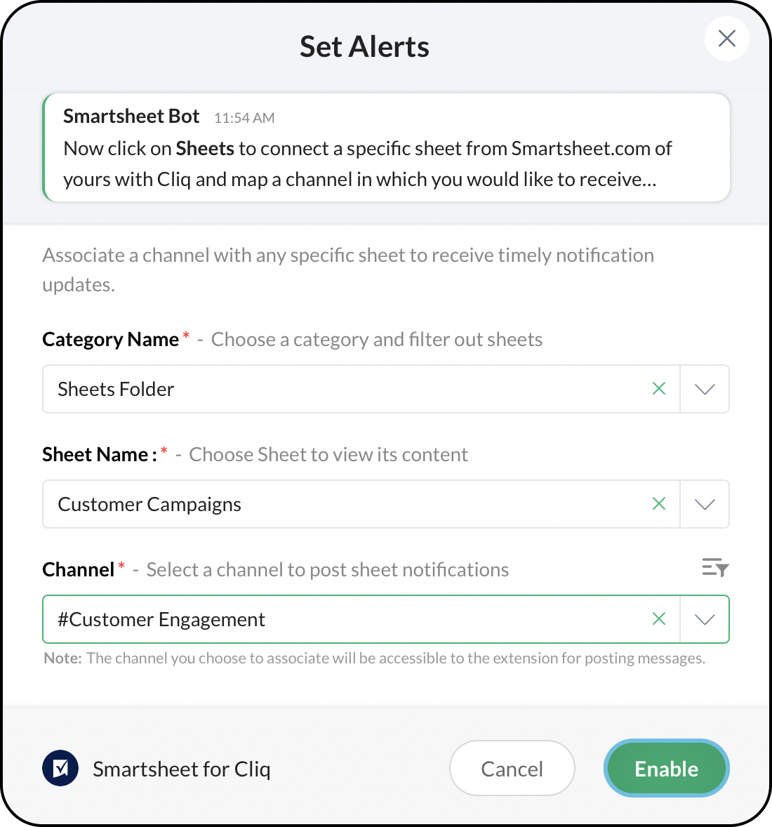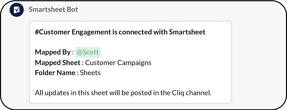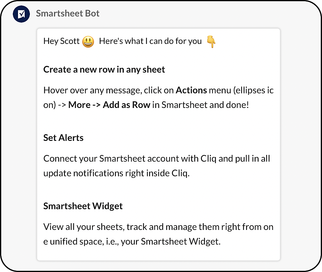 After successful installation of Smartsheet you will receive a welcome message along with a tour on how to use the extension. Using the Smartsheet bot, you can map a sheet to a Cliq channel and receive instant notifications on updates of the sheet in the channel.