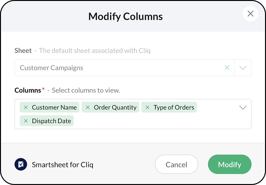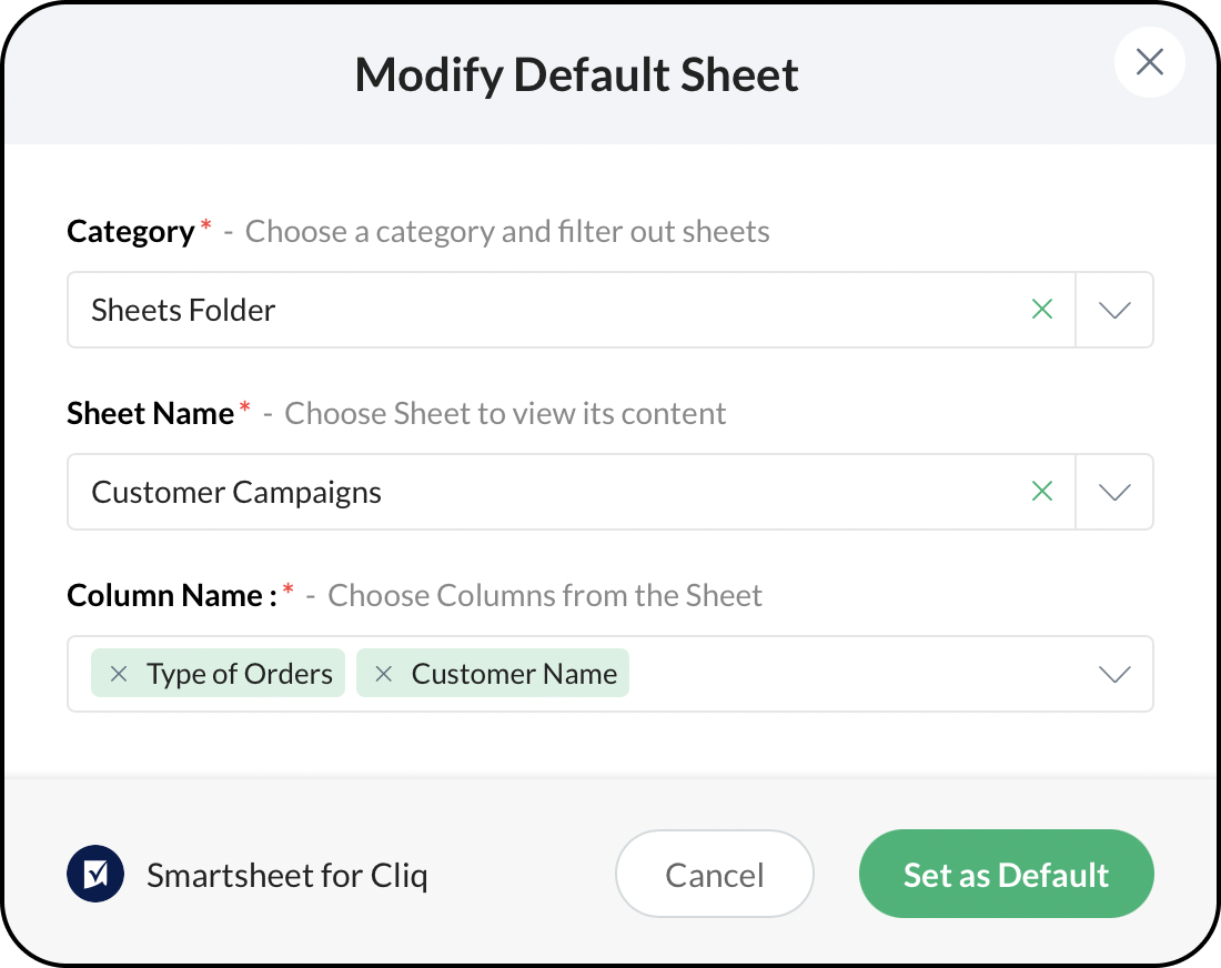 Modify Sheet- If you want to view or update some other sheet, you can select modify sheet. Once you have selected the sheet and columns you want to view, you can select Set as Default to view the sheet in the form of a widget.