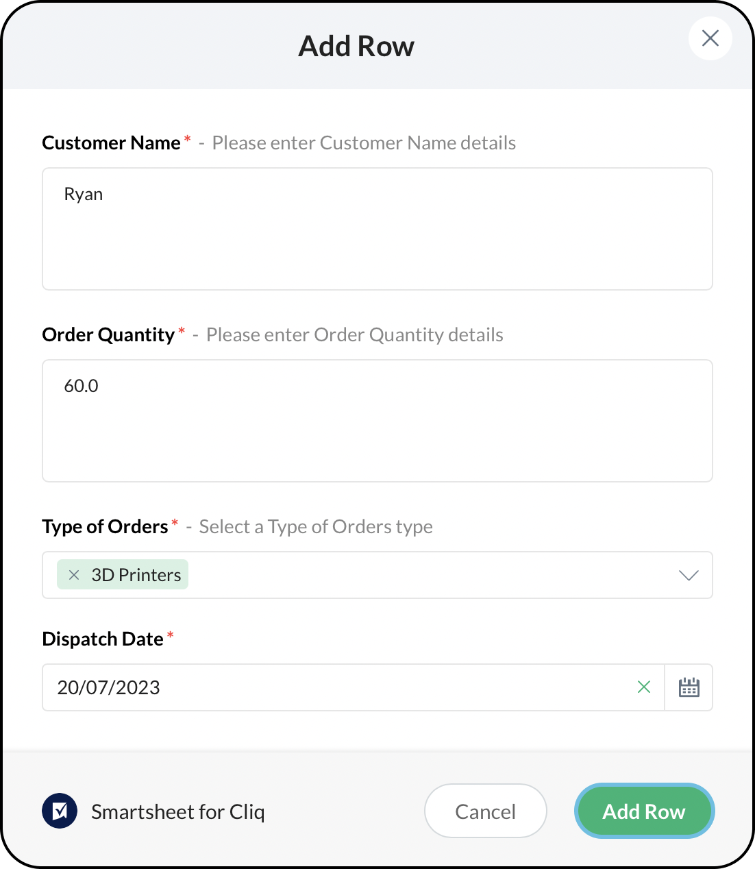 Add Row - You can update the sheet by adding rows using the Add Row button. A form will appear to fill the corresponding columns.