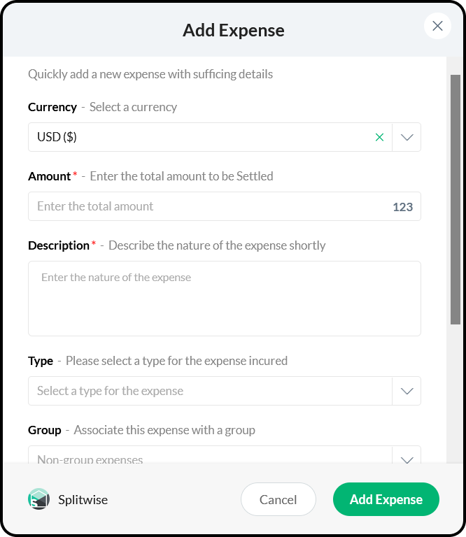 1. Add Expense - This option allows you to create a new expense by filling out an expense form. Once submitted, the expense will be added to your Splitwise account.