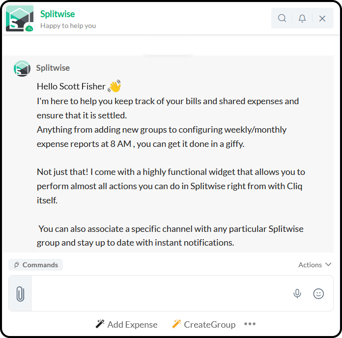 Upon installation, the SplitwiseBot will be your first point of interaction. It will welcome you and provide you with three menu options: