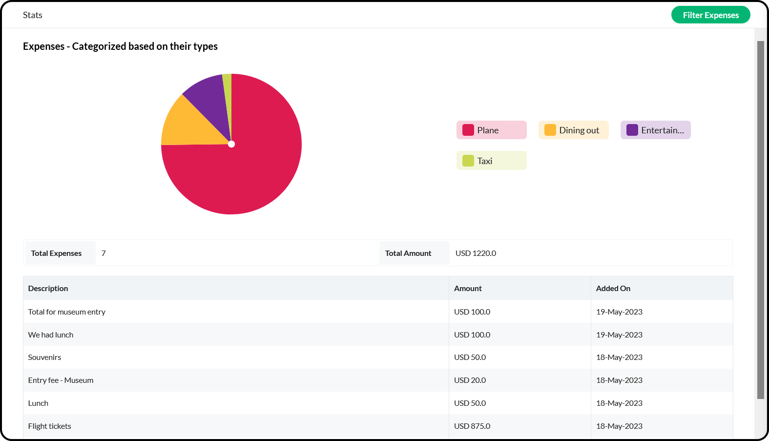 The Stats tab displays expenses made by the user in Splitwise. It also includes a Filter Expense button that allows you to filter and view expenses made within a specific duration, with a specific group, or with a specific friend.