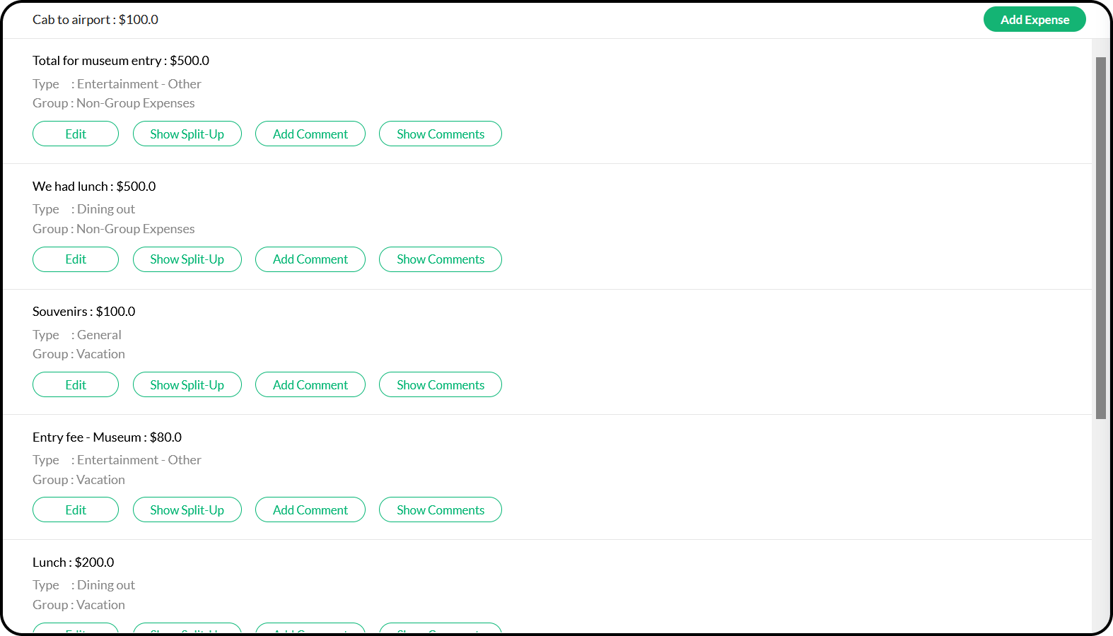 3. Show Split-Up: By clicking on this option, you can view the shares of the expense listed below it.