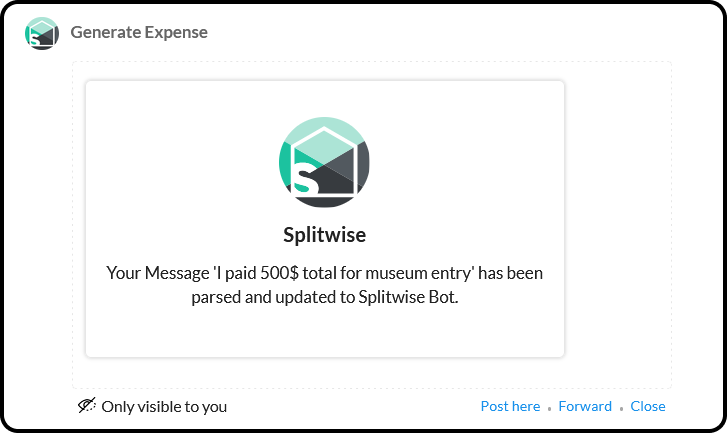 In addition to these menu options, the SplitwiseBot also parses messages that you send to it and automatically creates expenses in your Splitwise account.