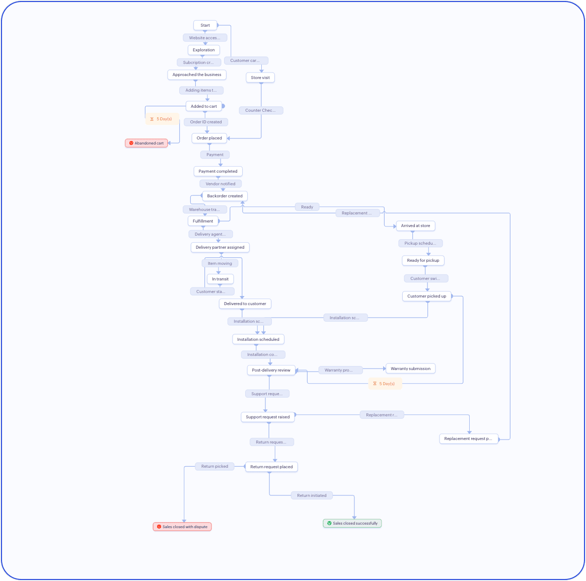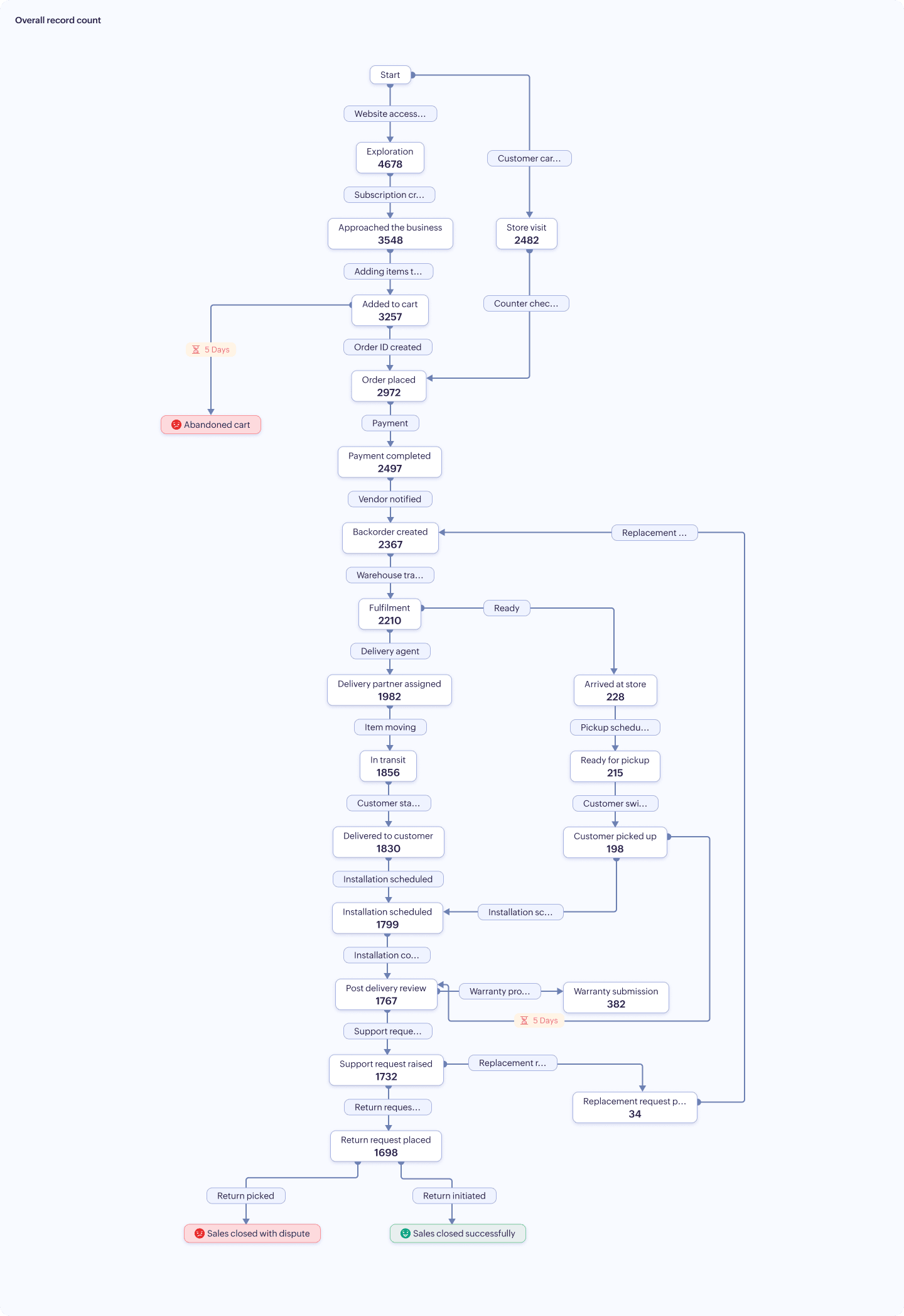 From exploration to sale closure, Zylker can respond with the right actions to customers based on their choices. Now, to monitor the drop-outs, returns, cart abandonment, Zylker can keep a close eye on the turn of events by monitoring records movements across the stages.