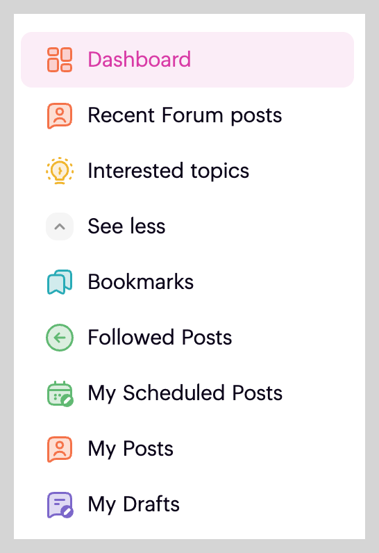The Dashboard acts as your forum home page. It brings together an overview of discussions across categories, recent activity, and posts trending within your network. It’s the quickest way to get a pulse on what’s happening.