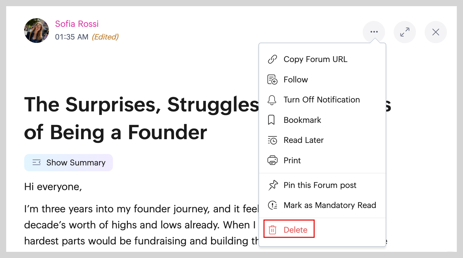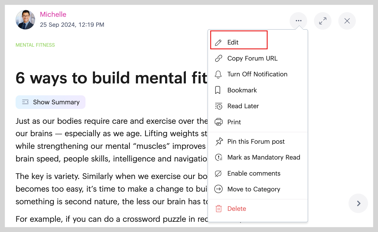 You can edit a forum post to update its content or fix errors anytime after publishing. If a post is no longer relevant, you can delete it to remove it from the forum.