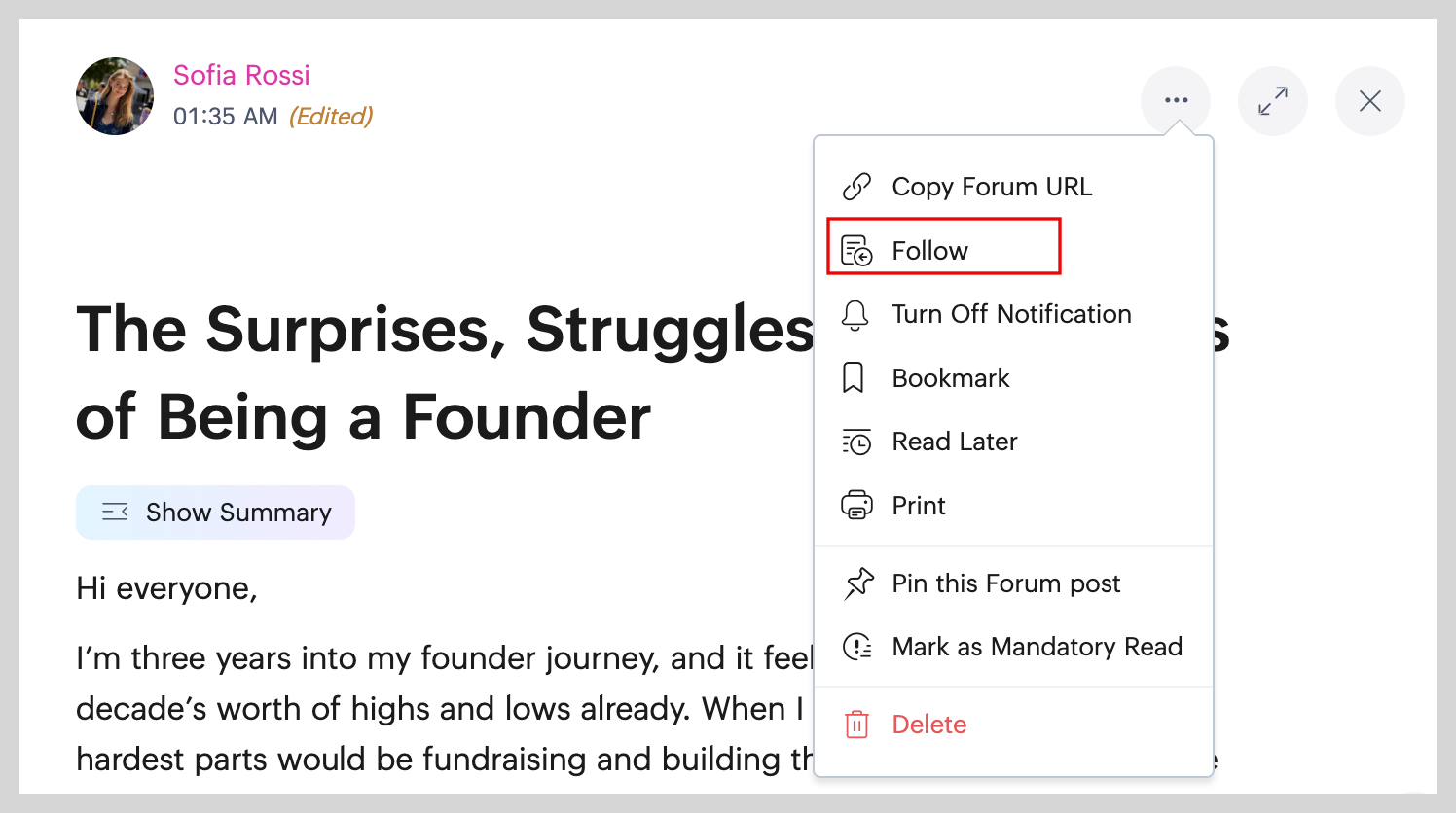 Following a forum post helps you stay updated on new replies and activity in it. Once you follow a post, it appears in your feed and you’ll be notified whenever someone comments or adds to the conversation.