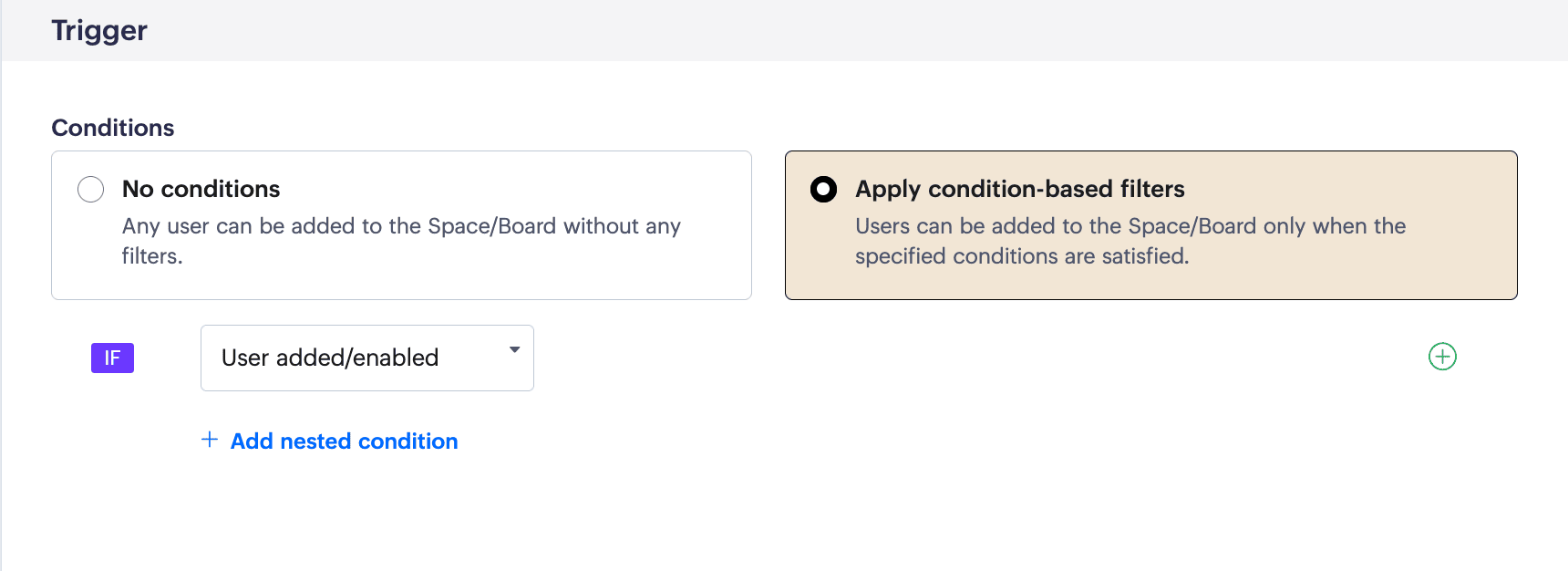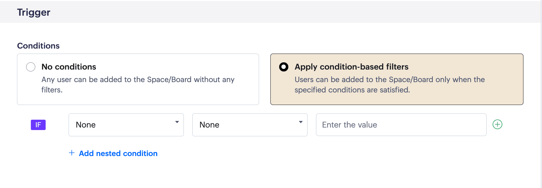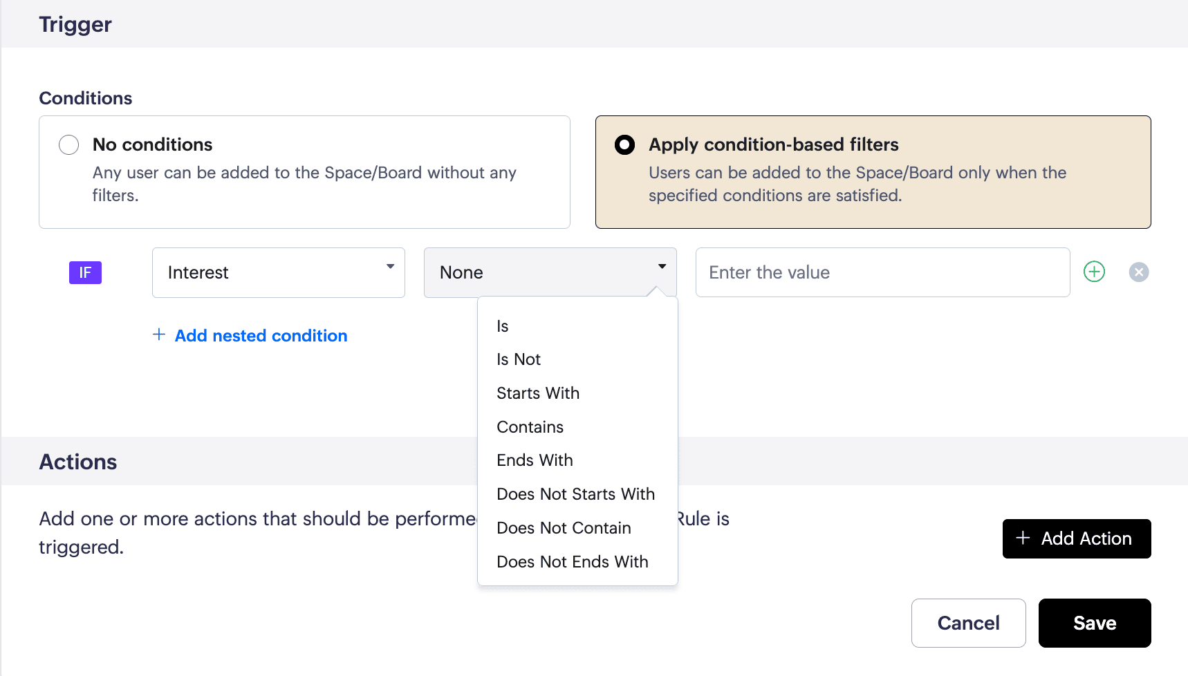 Choose No Condition only when every member should receive the same action. In most cases, you will use Apply condition-based filters so the system can decide who should be added where.