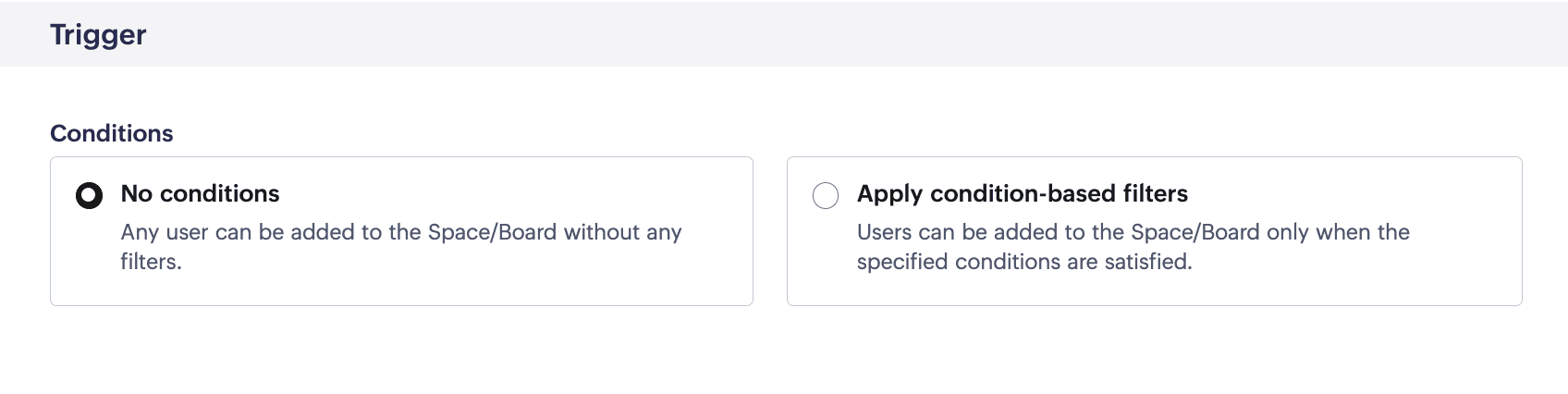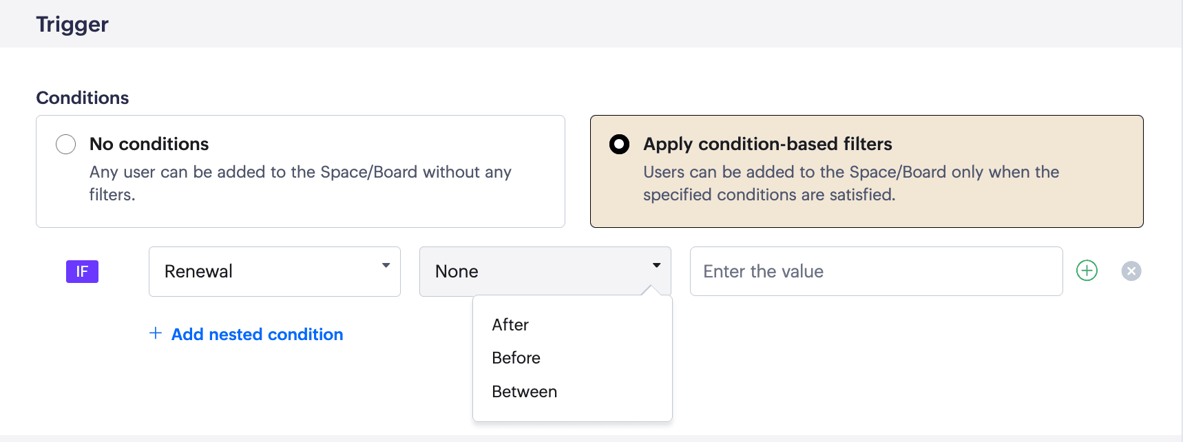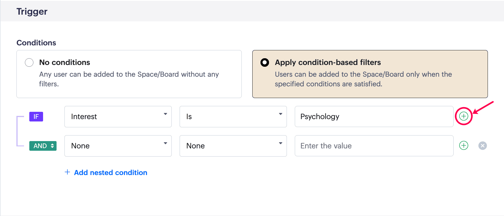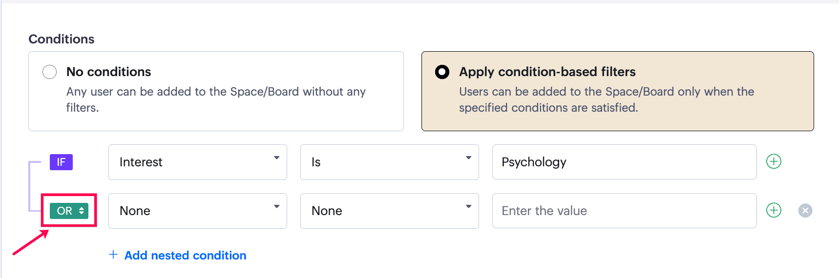 Choose No Condition only when every member should receive the same action. In most cases, you will use Apply condition-based filters so the system can decide who should be added where.