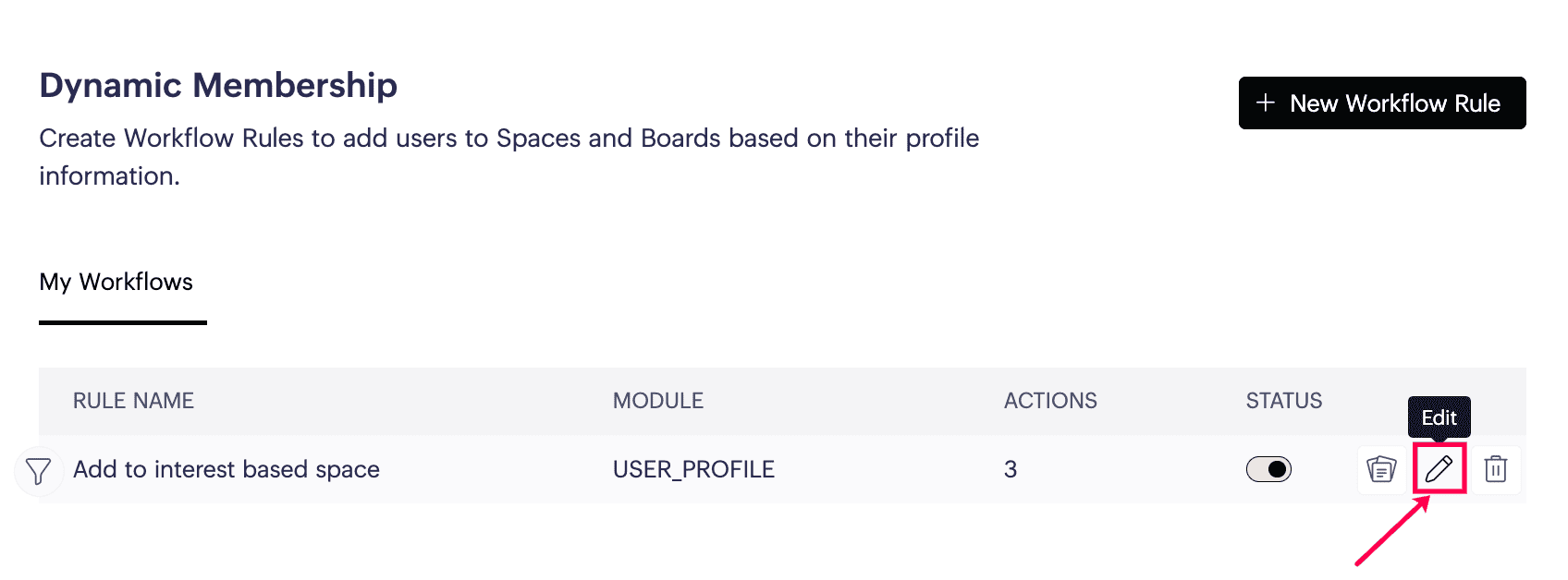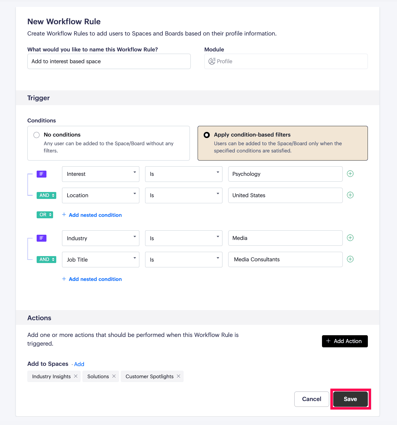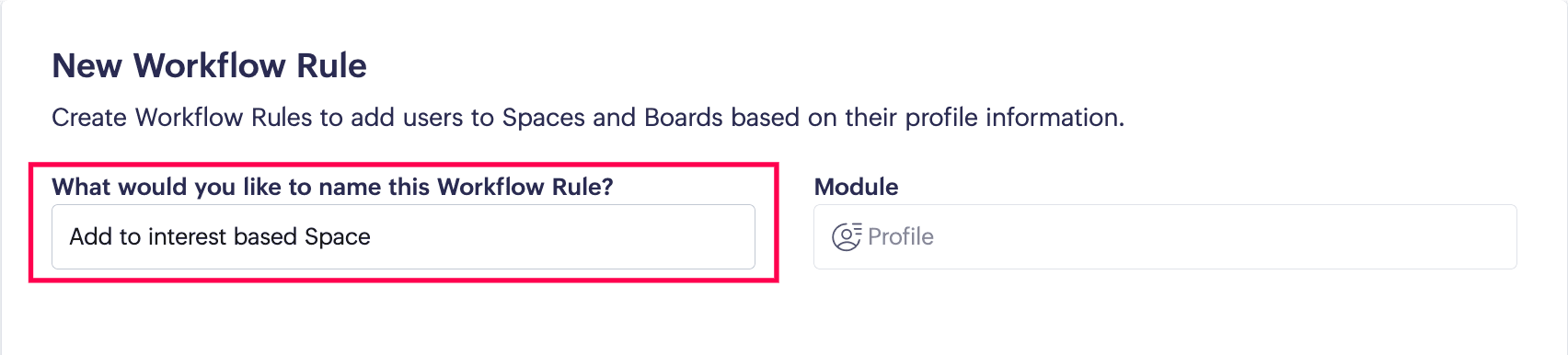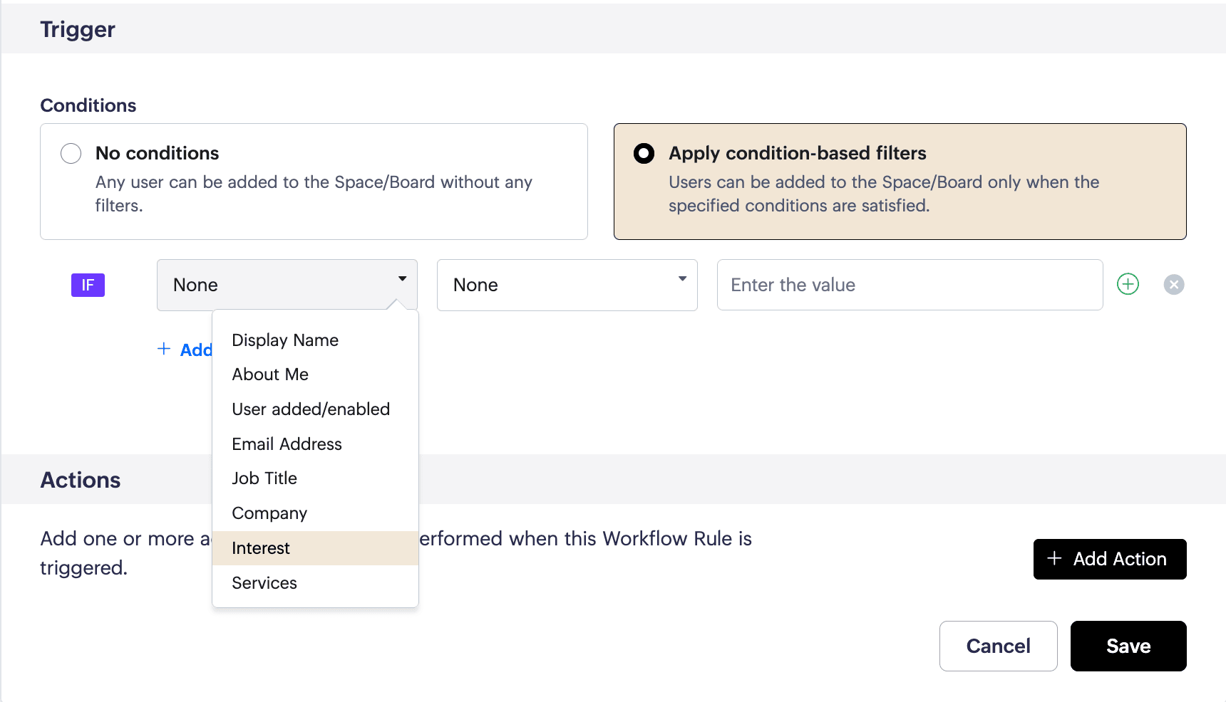 Dynamic Membership helps you automatically place members into the right spaces or boards based on their profile information. Instead of adding members manually, you create a workflow rule that checks profile fields, such as interests, skills, and custom profile fields, then performs an action when the rule matches. Each time a new user is added to the community or an existing profile is updated, the rule is triggered.