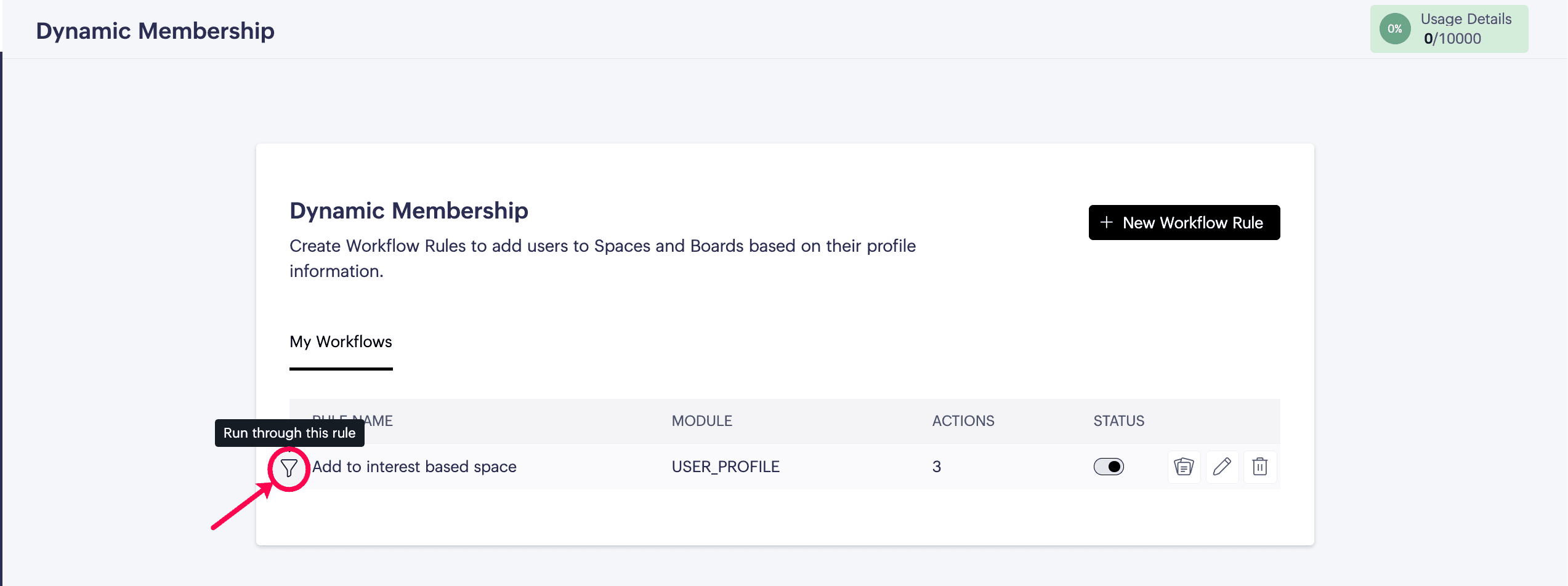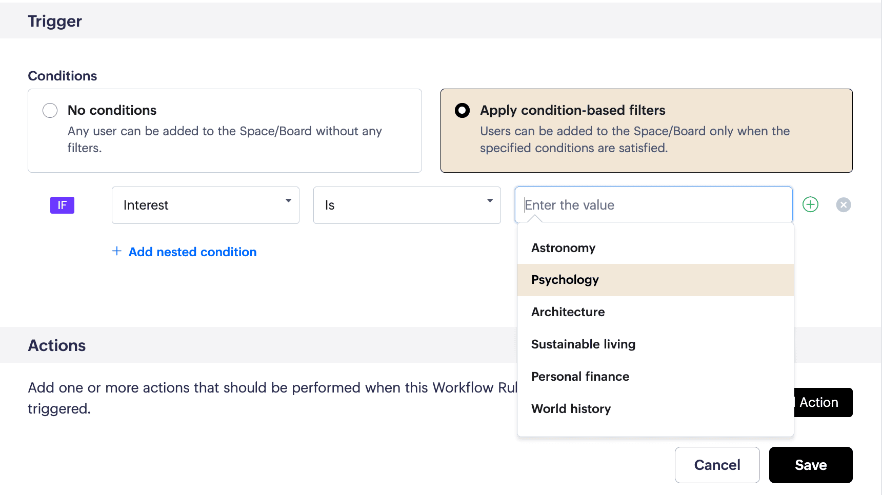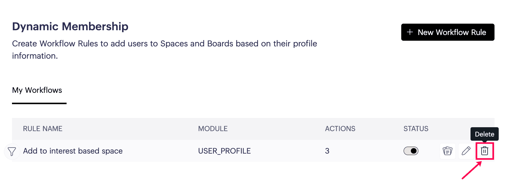 Dynamic Membership helps you automatically place members into the right spaces or boards based on their profile information. Instead of adding members manually, you create a workflow rule that checks profile fields, such as interests, skills, and custom profile fields, then performs an action when the rule matches. Each time a new user is added to the community or an existing profile is updated, the rule is triggered.