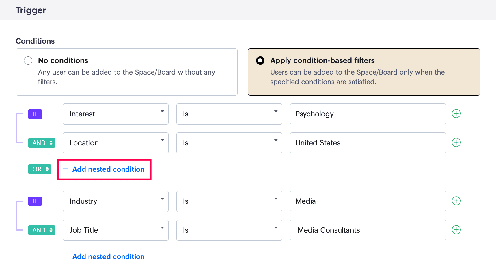 Click + Nested Condition if you want grouped logic inside the same rule.
