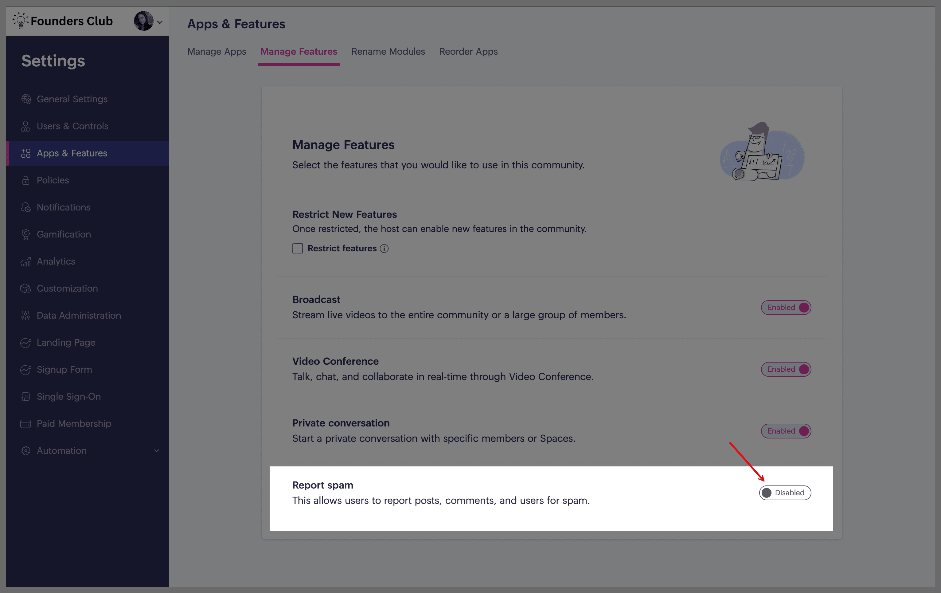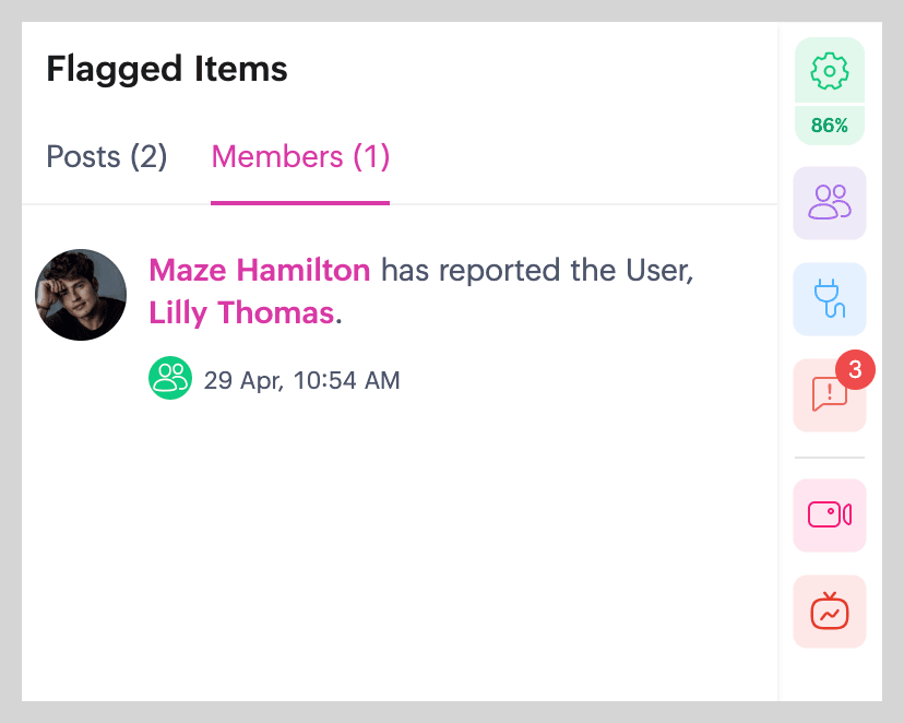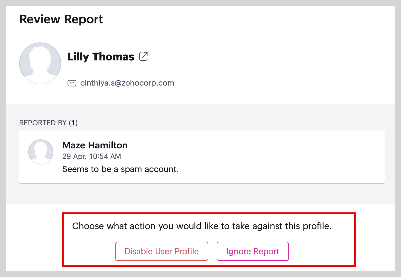 In Zoho CommunitySpaces, any posts, comments, or users flagged by members must be reviewed by the community hosts and Super host.