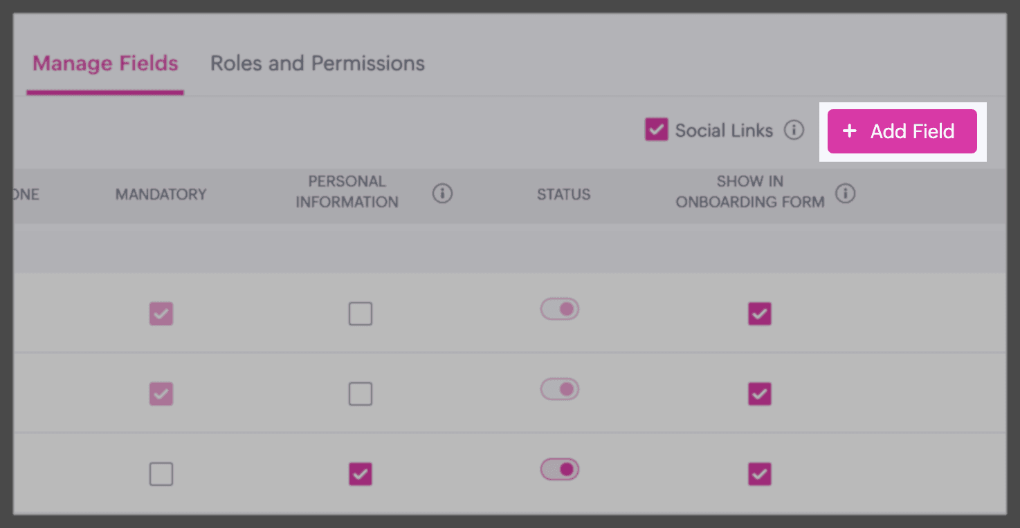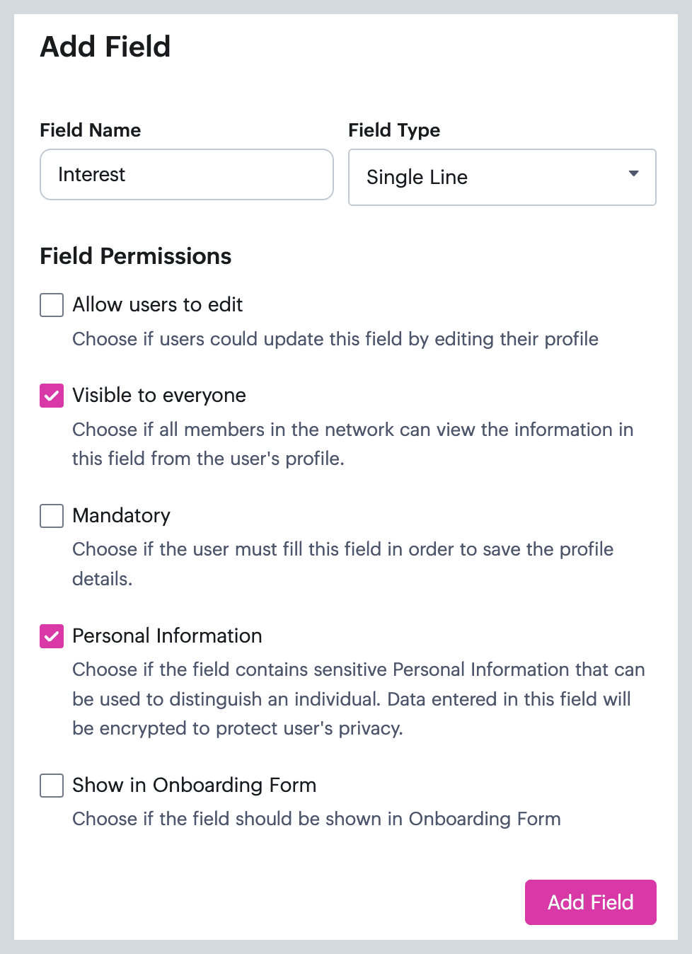 From the pop-up, add the field name, type (i.e., text, dropdown, date, checkbox), and customize the field permissions.