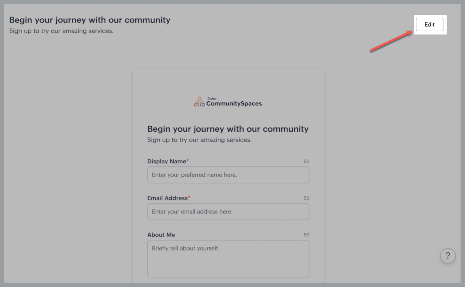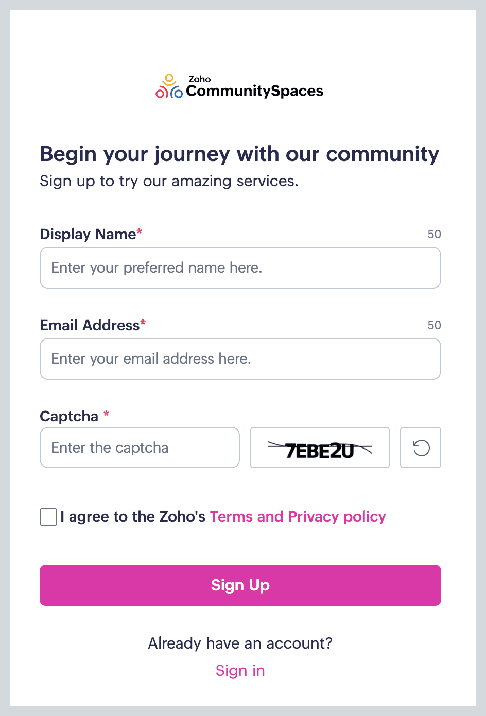 The sign-up form in Zoho CommunitySpaces is for gathering important information about new members and ensuring a smooth onboarding onto the platform. This also helps to ensure only legitimate members join your community.