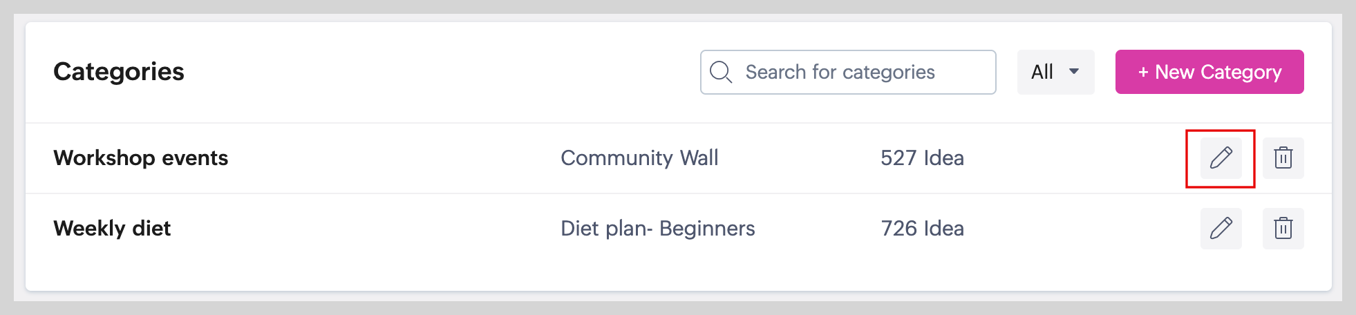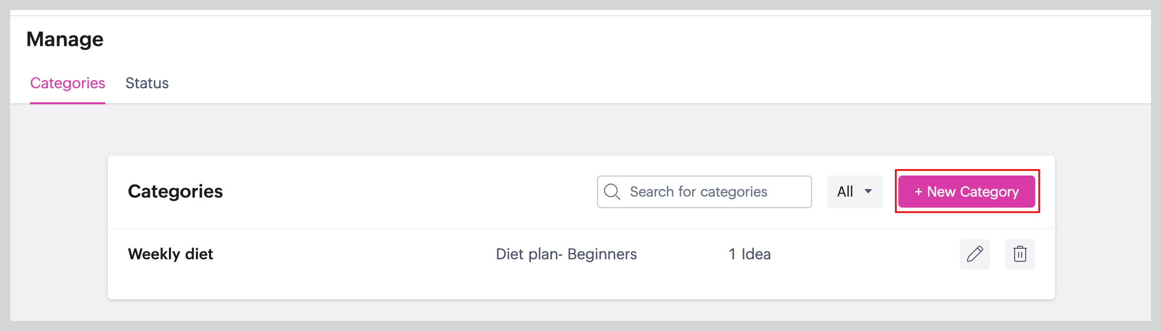 To delete the category, click the trash icon next to the category and click Delete category to confirm.