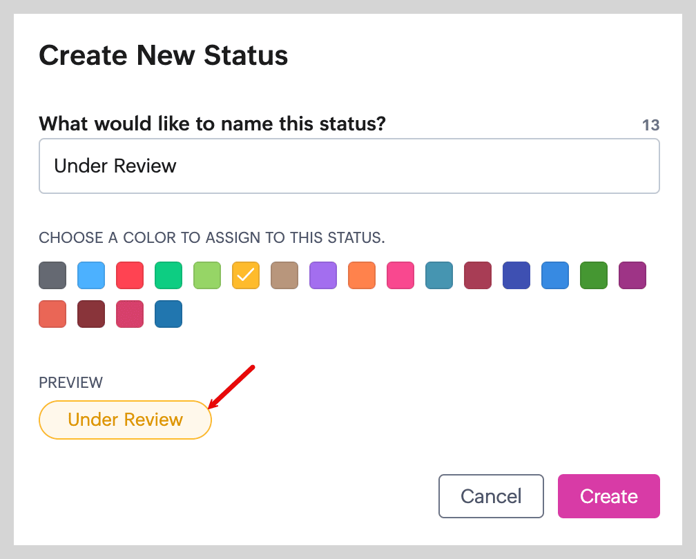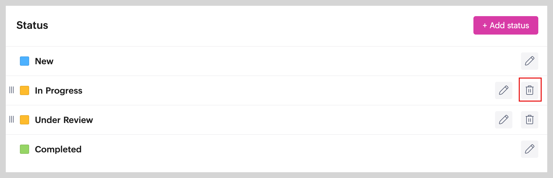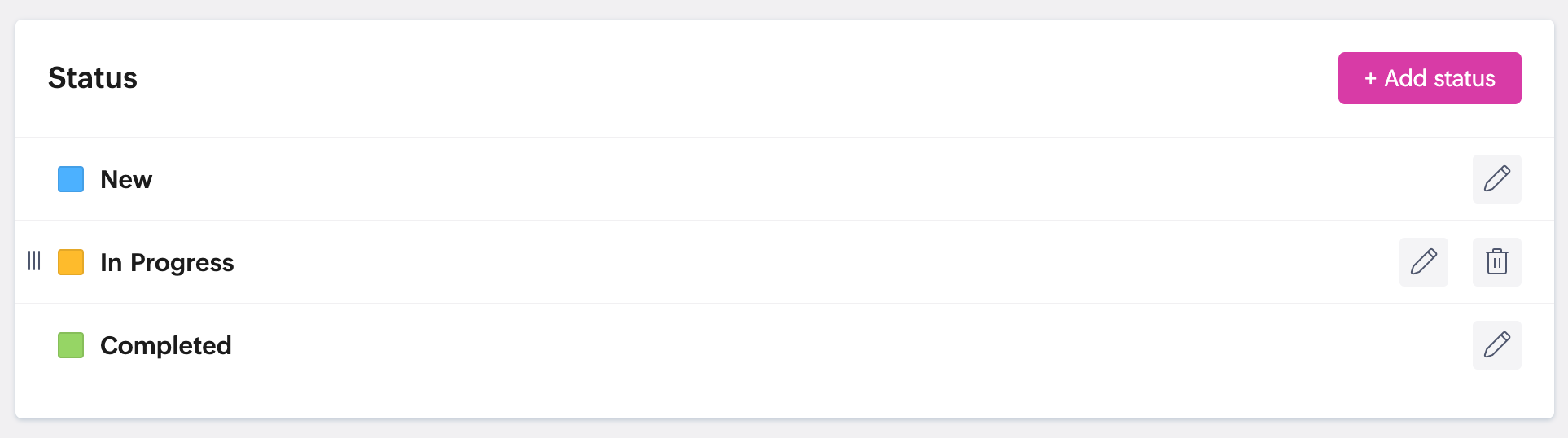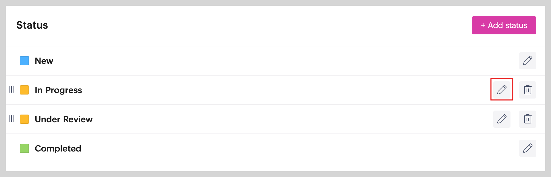 To edit a status, click the pencil icon next to the status name. Make your changes and click Update.